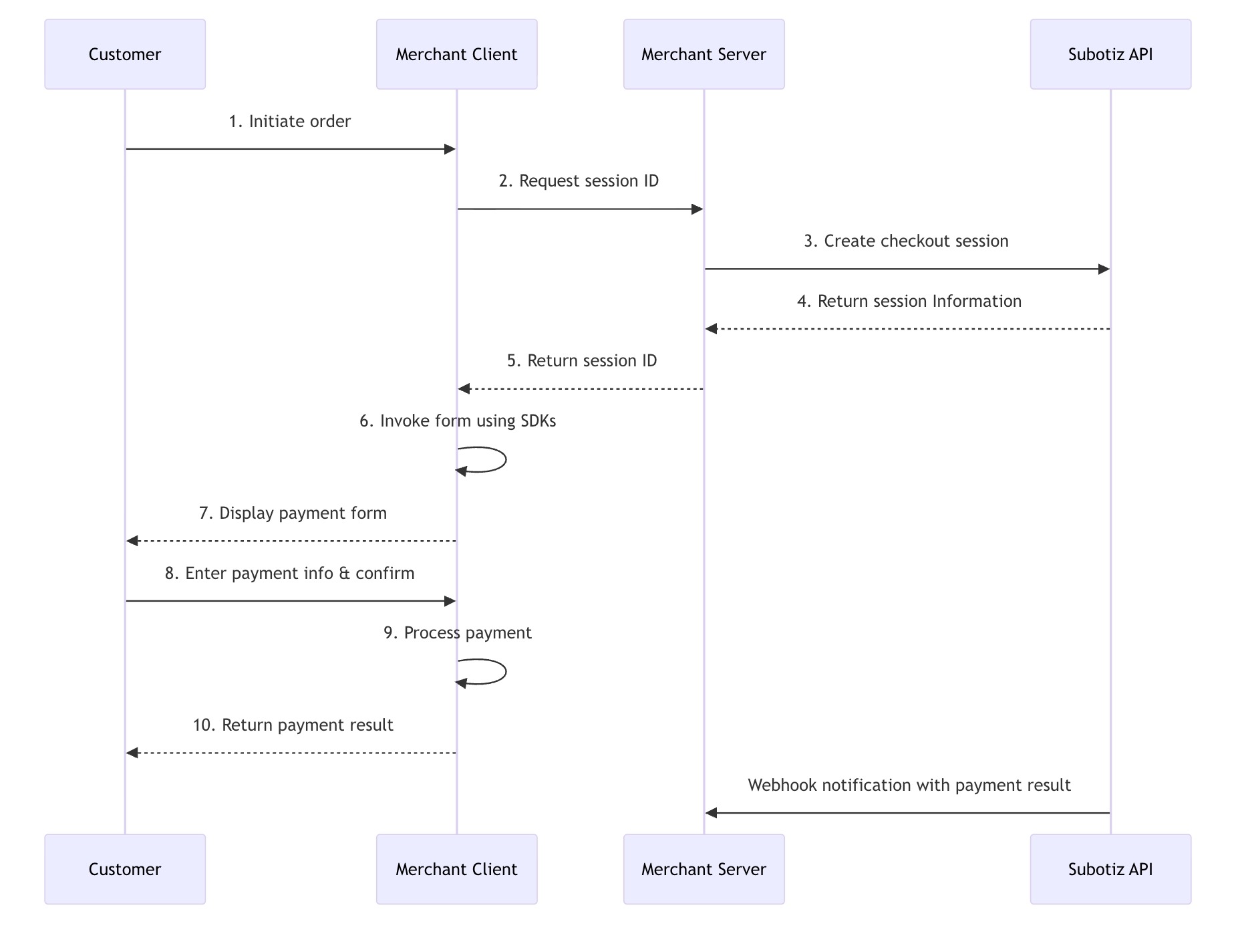 order_id(your platform's unique order identifier) as a parameter to facilitate subsequent association with the trade order. - The Checkout Session returns a Session ID. Your client-side application can then use the SDKs to invoke and display the Subotiz payment form to the customer.