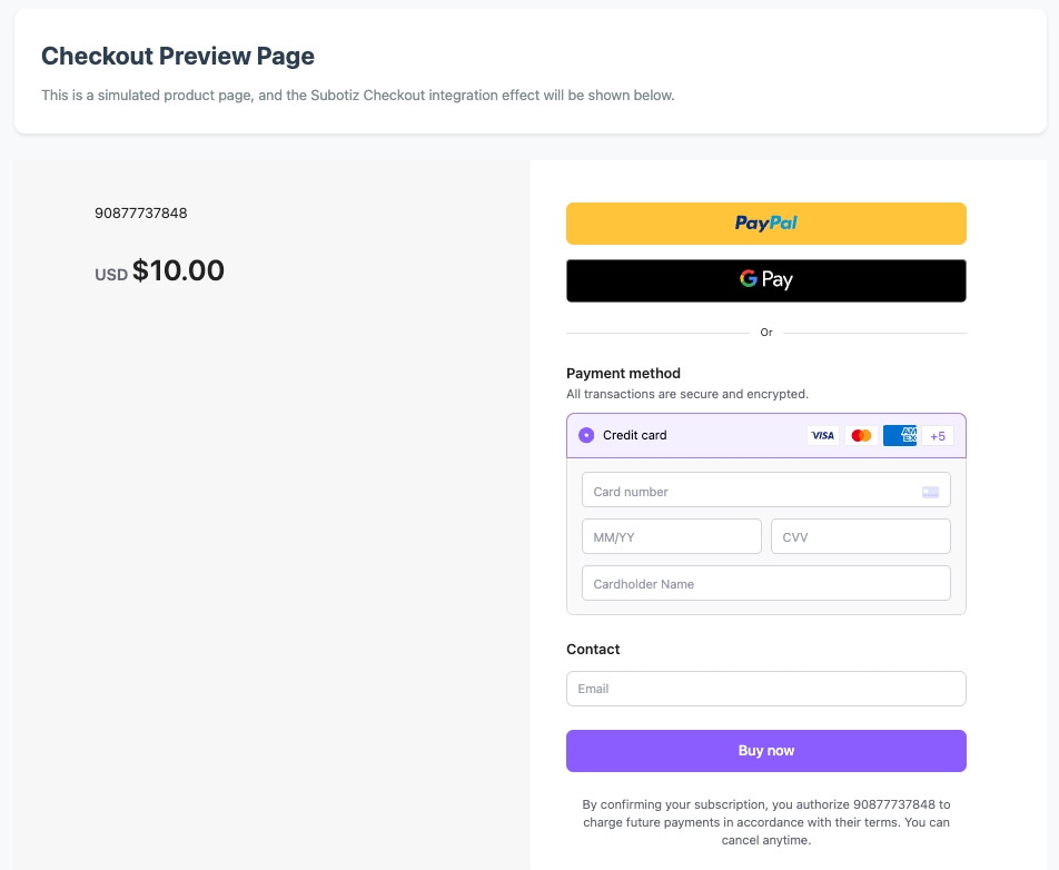 Entering payment processAfter that, a complete checkout page or partial payment forms will be opened within the same framework of your website or app. They will no longer display order details, but still request customers' emails. Meanwhile, the payment form is also displayed, including the card payment form and other payment methods Subotiz supports, such as Google Pay, Apple Pay, and PayPal.Demo of embedding a complete page