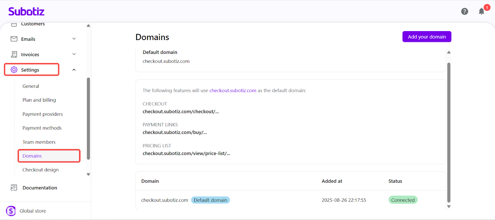 Access domains: Go to Settings > Domains in your Subotiz admin to view and manage all domain connections. This page displays: