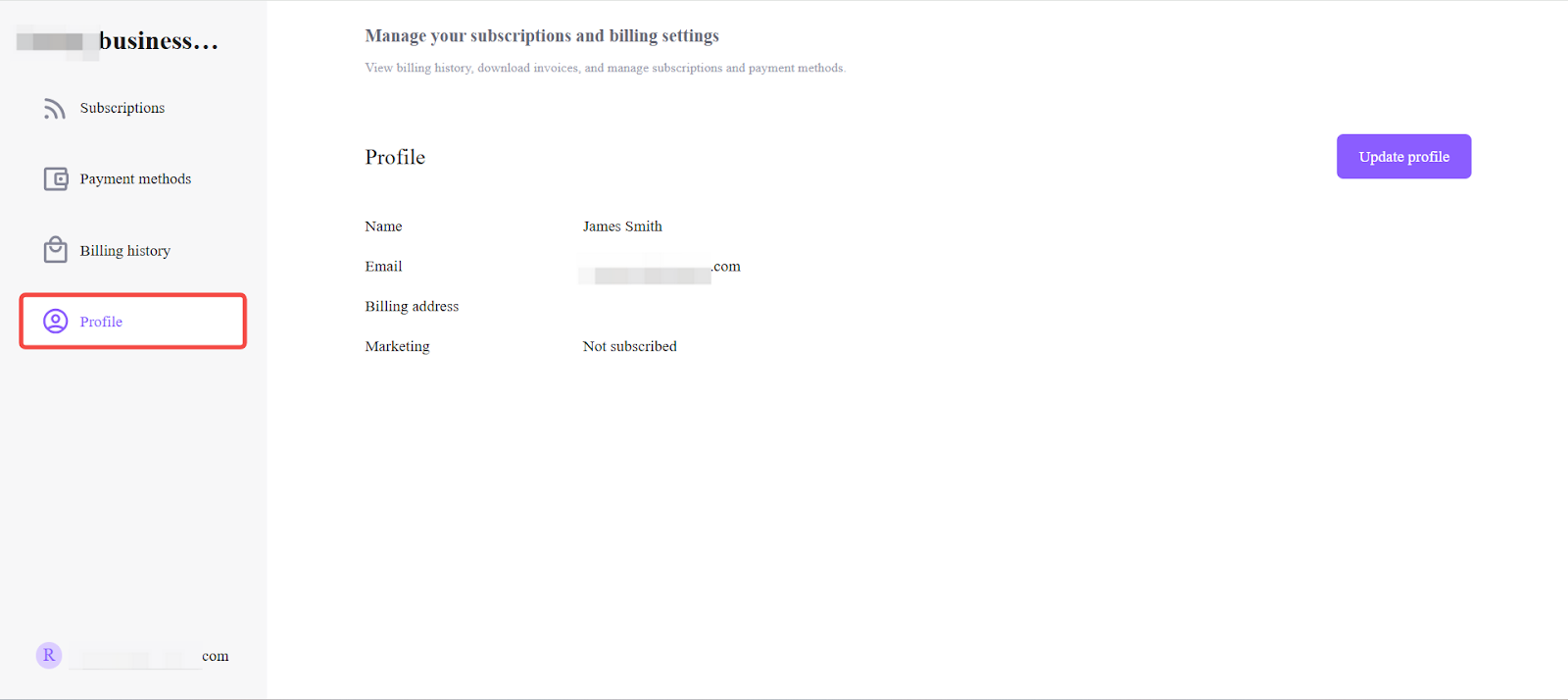 - Profile: The Profile section displays the customer’s personal and billing information.Customers can view or update: