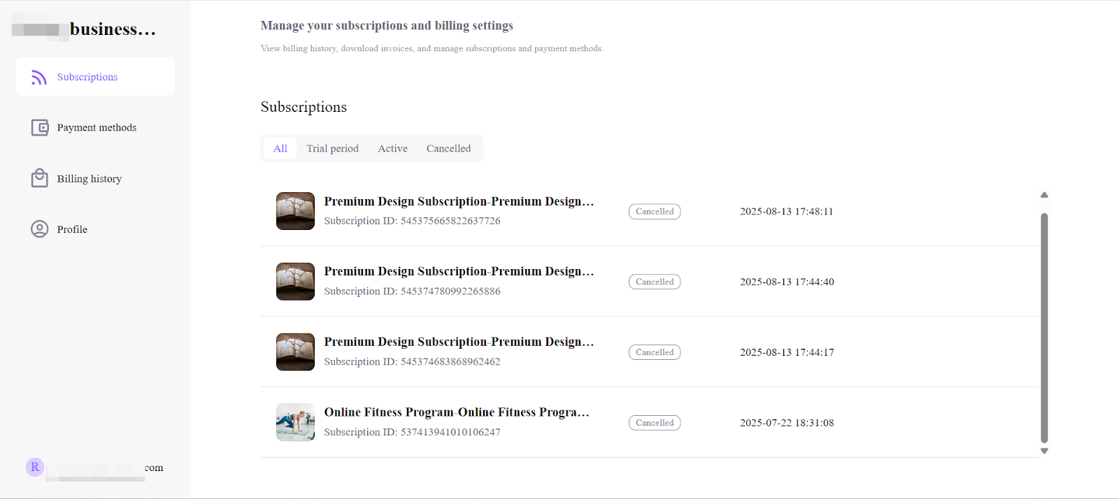 - Subscriptions: The Subscriptions section lists all active, trial, and cancelled subscriptions associated with the customer.Customers can: