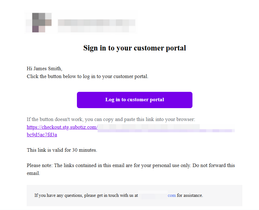 - Magic link email: The email includes a button that takes the customer directly to their Portal. A fallback URL is also provided in case the button cannot be clicked. The link is valid for 30 minutes to ensure secure access.