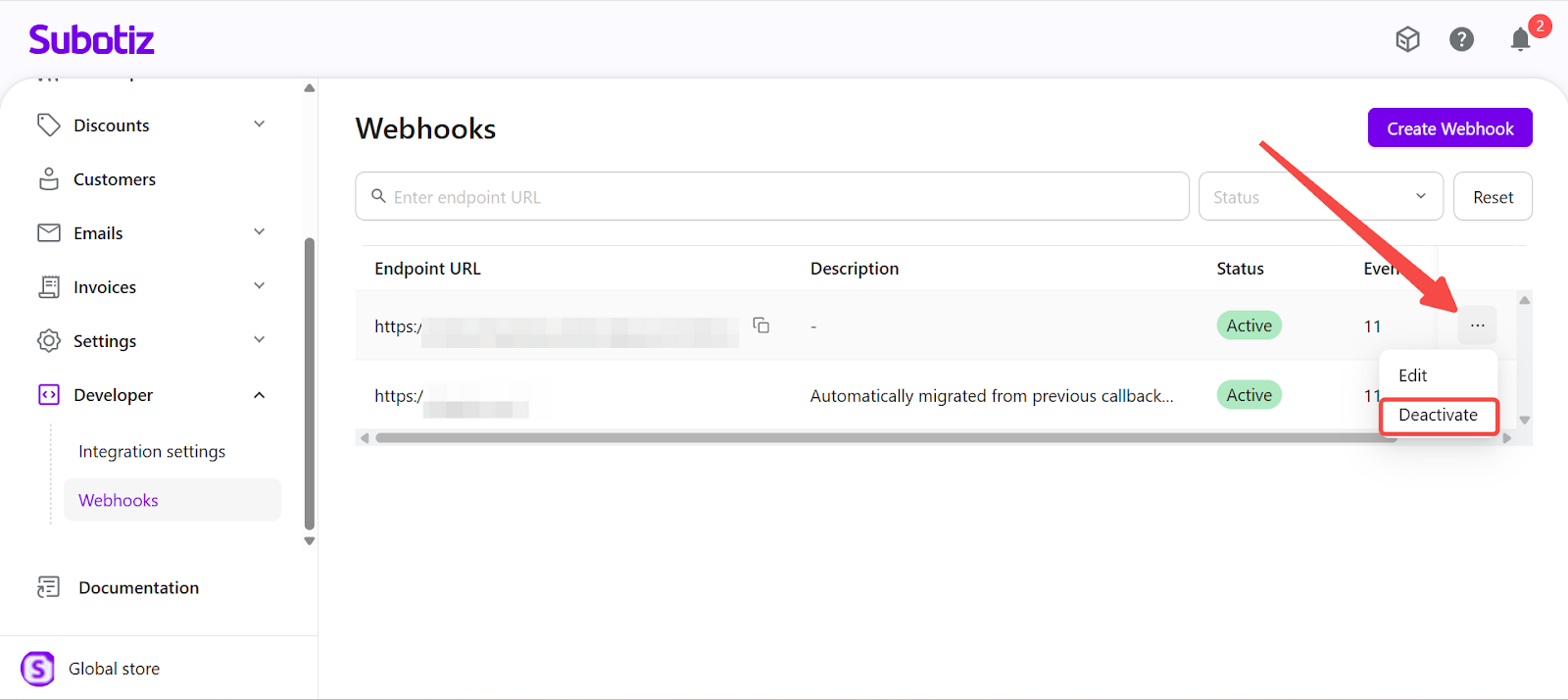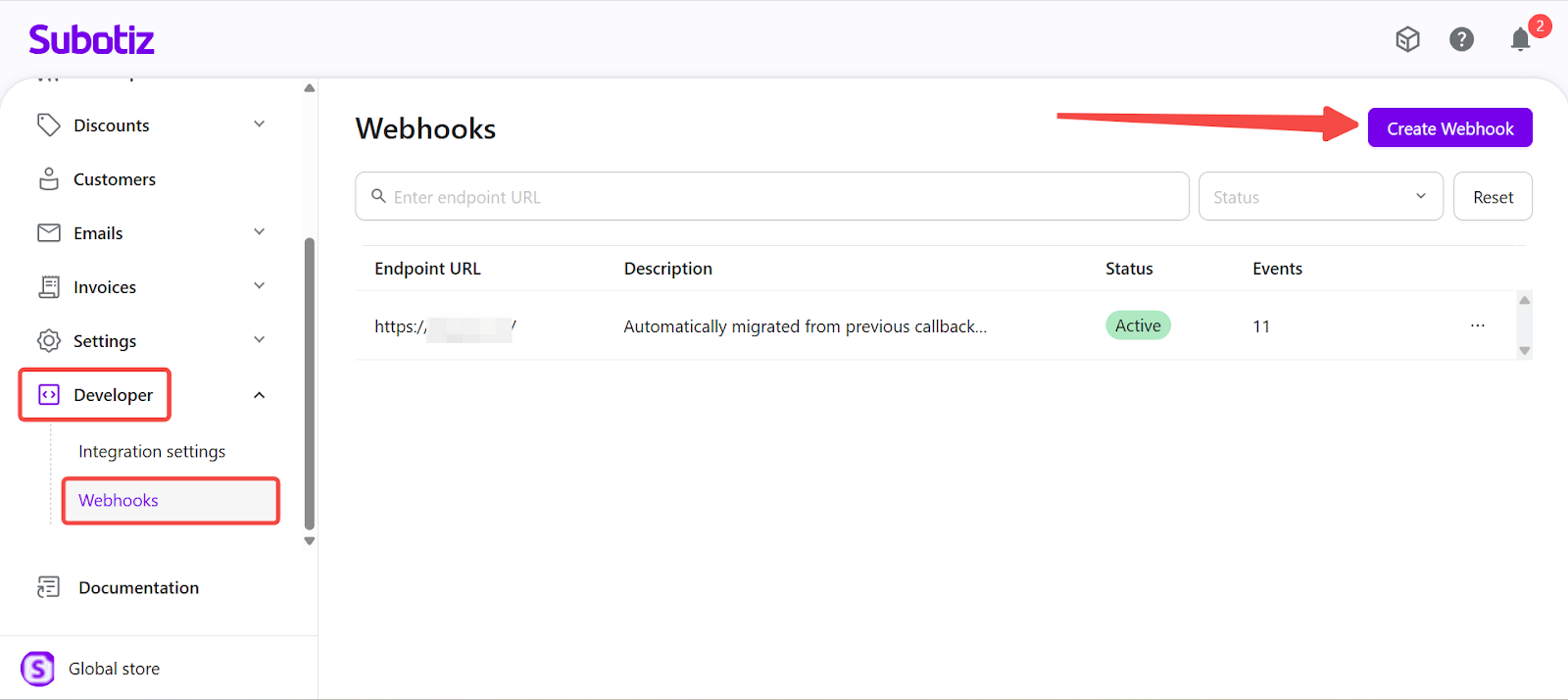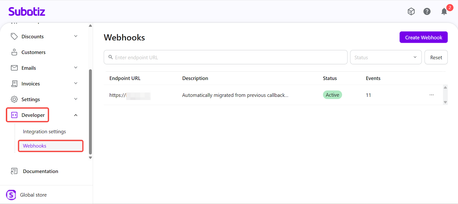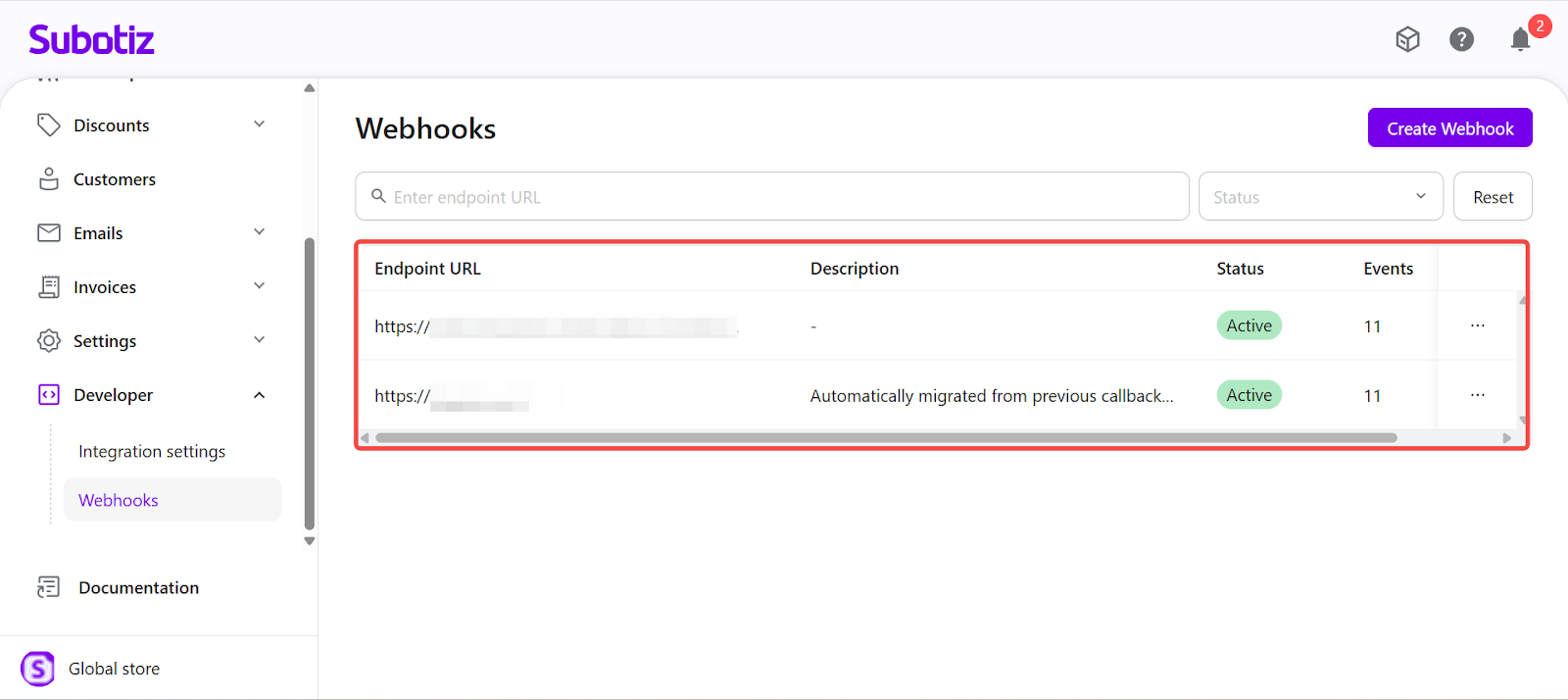- Each Subotiz account supports a maximum of 10 Webhook endpoints.
