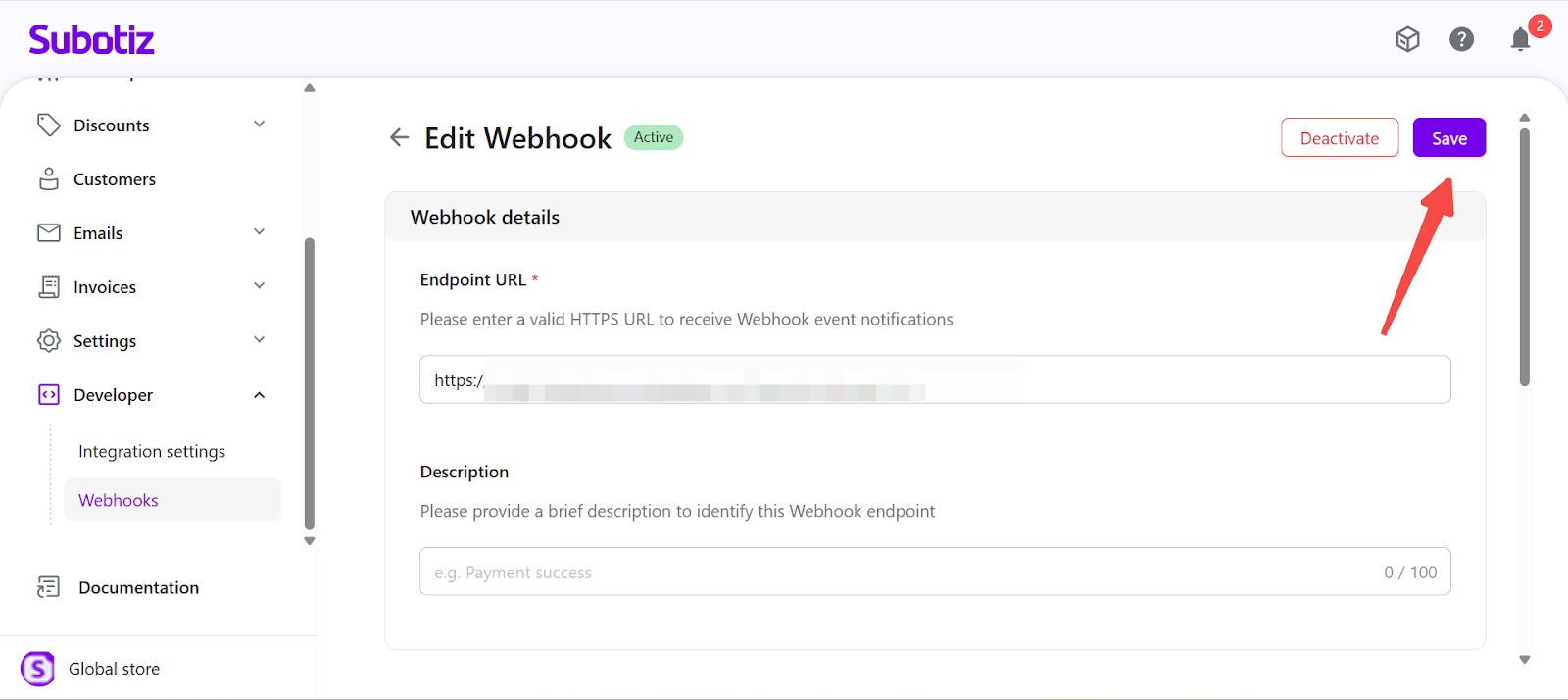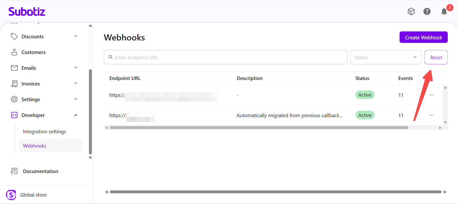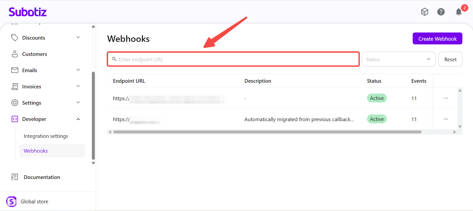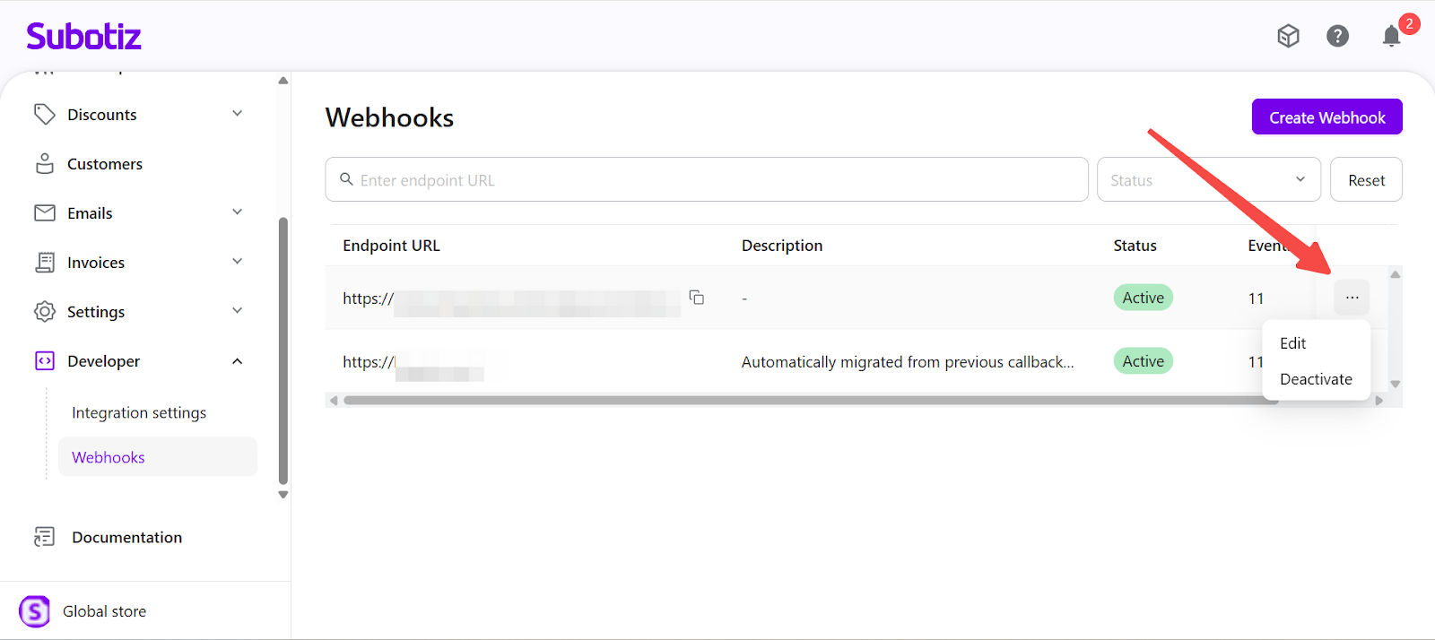 - Each Subotiz account supports a maximum of 10 Webhook endpoints.