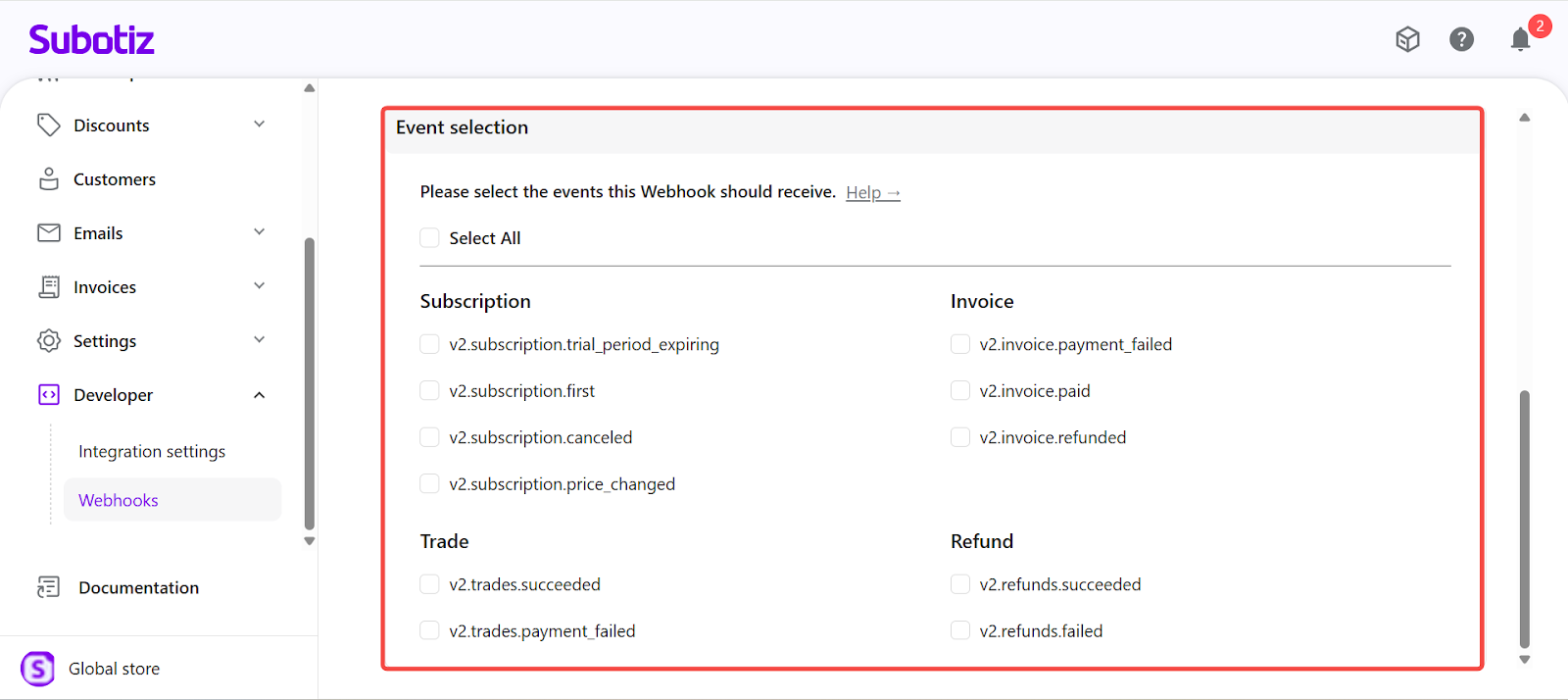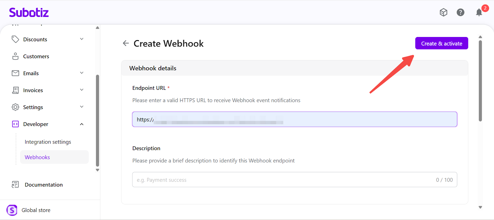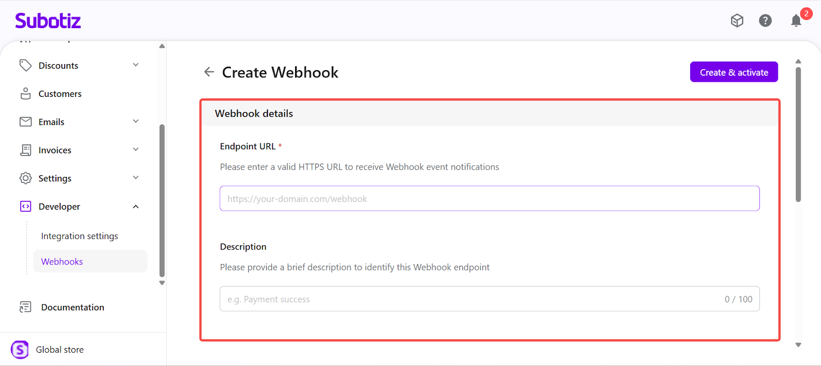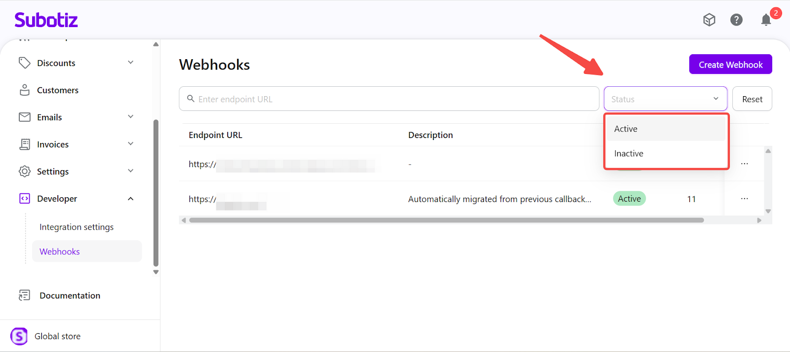 - Each Subotiz account supports a maximum of 10 Webhook endpoints.
