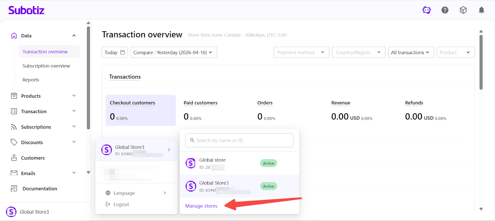 - Open the management page: Click Manage stores from the store panel.