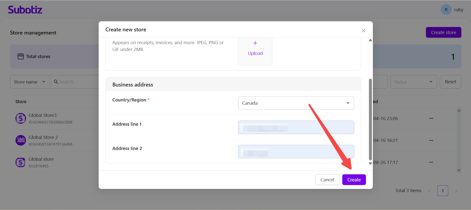 - Submit the store: Click Create. The store is created automatically after submission.