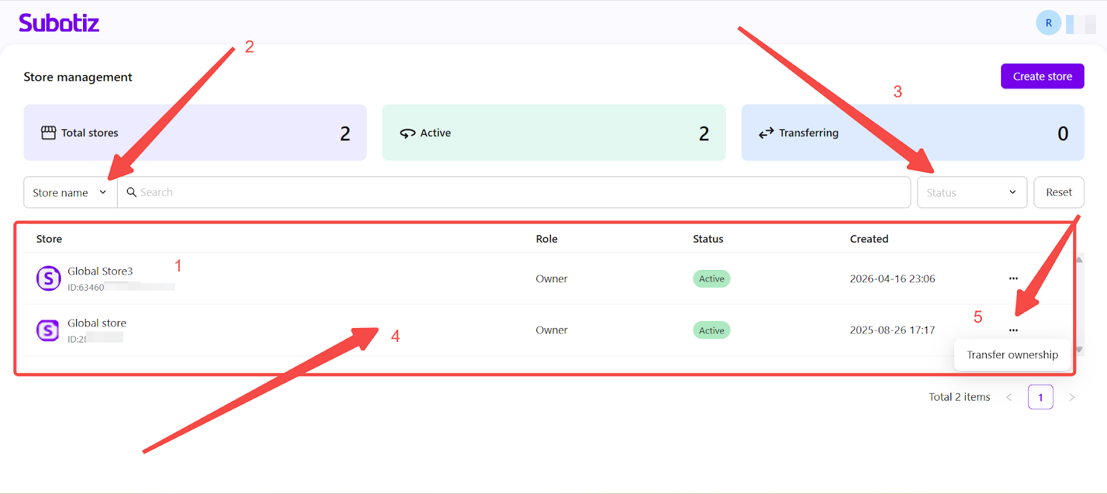- Transfer ownership: Open the action menu for a store and select Transfer ownership.