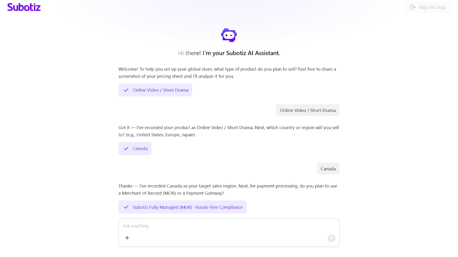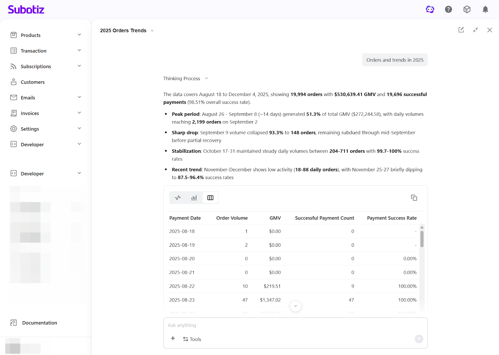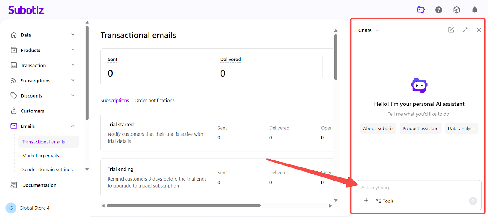 The AI Assistant in Subotiz provides a unified interface for store setup, email template editing, and data analysis through a single conversation panel. By combining guided workflows with natural language interaction, it simplifies daily operations and reduces the need for manual configuration or technical knowledge.