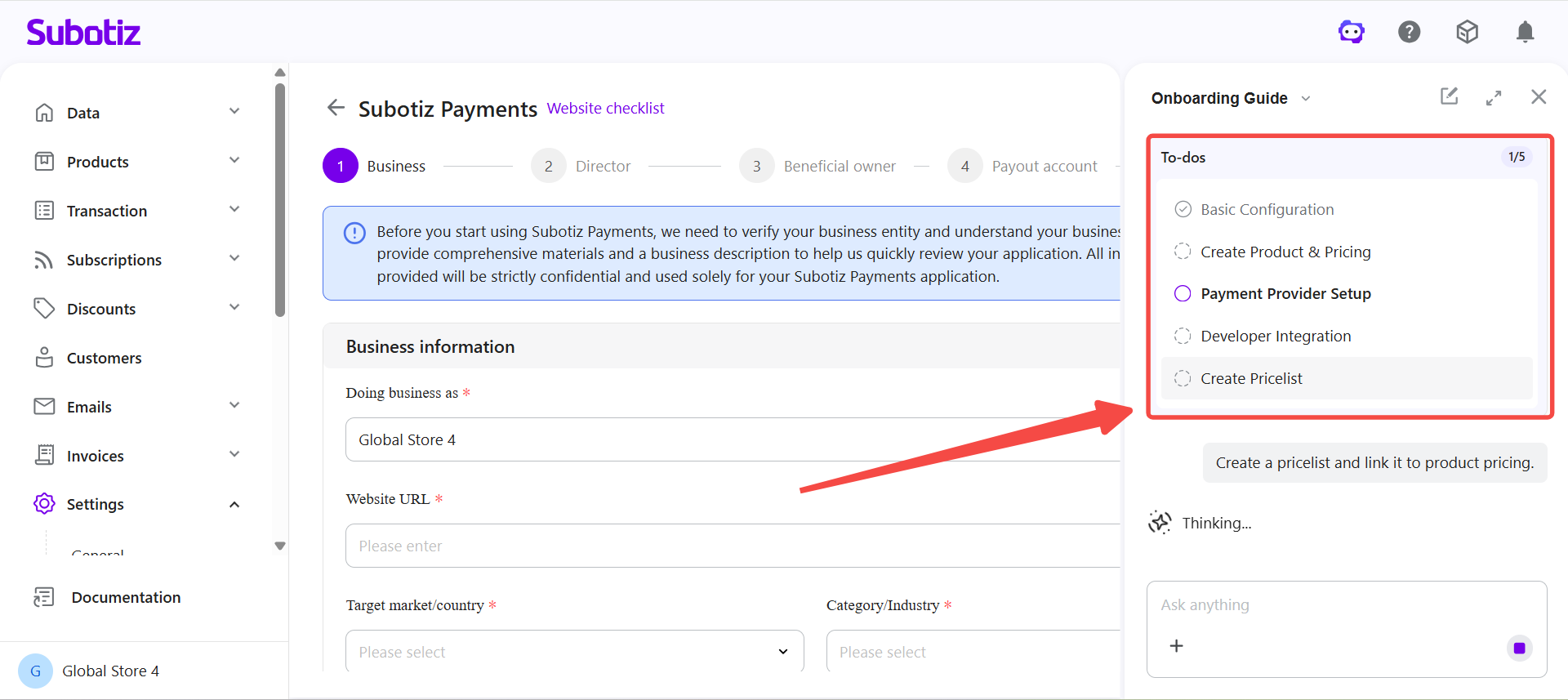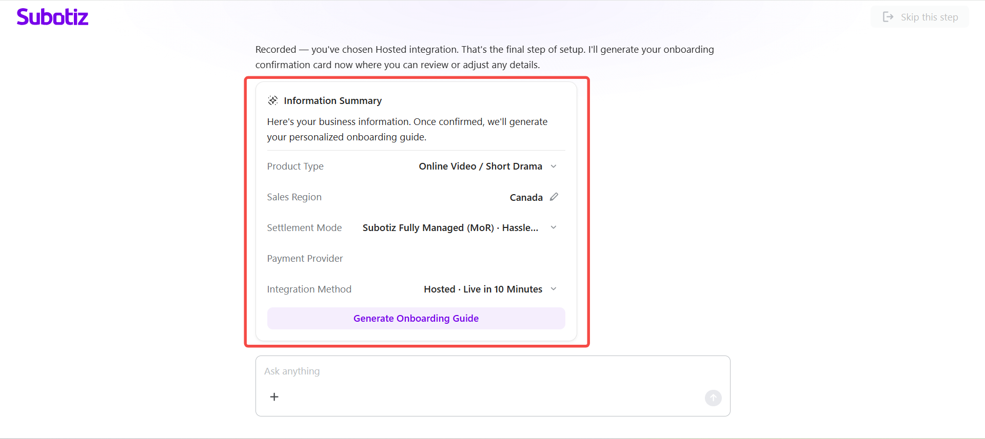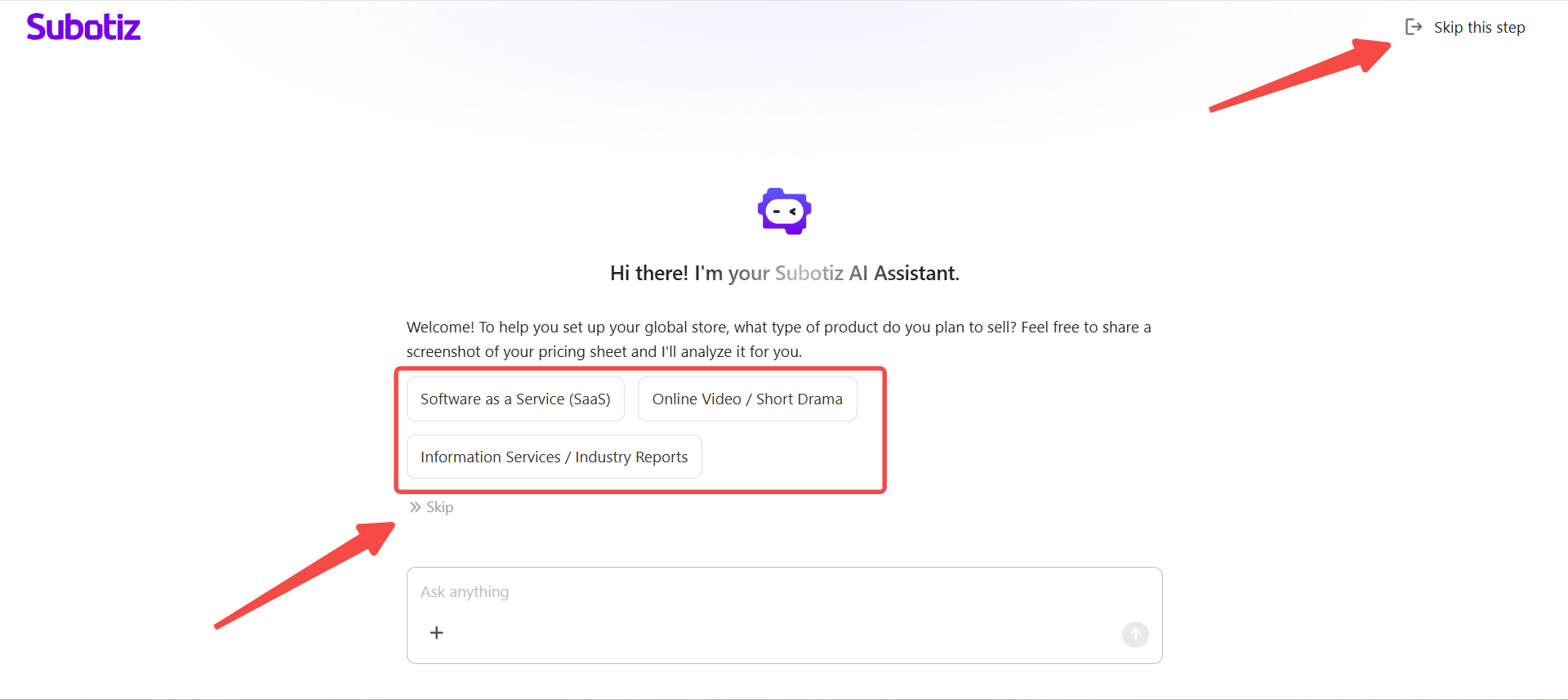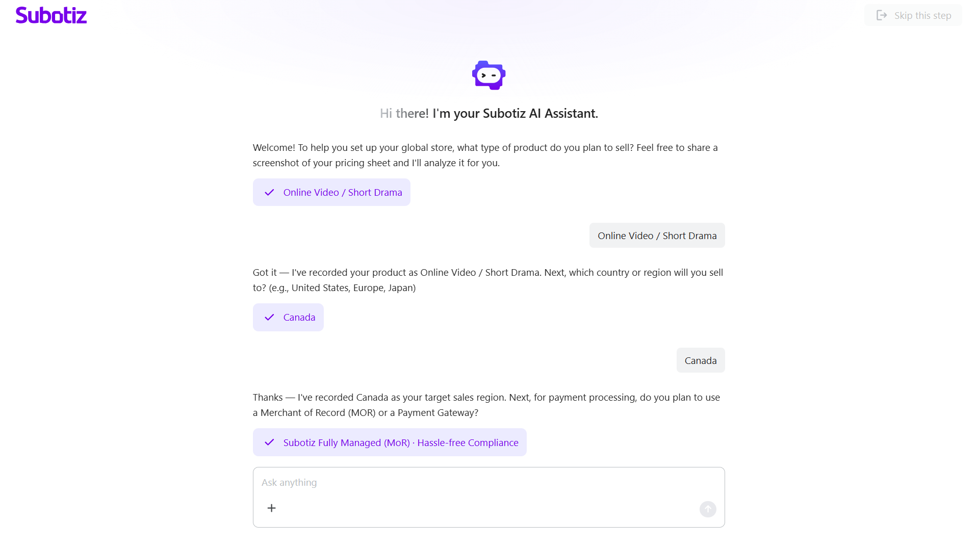 AI Onboarding in Subotiz starts automatically after registration and guides merchants through store setup using a short, conversation-based workflow. Instead of manual configuration, merchants provide business details through guided questions, and the system generates a personalized onboarding plan.