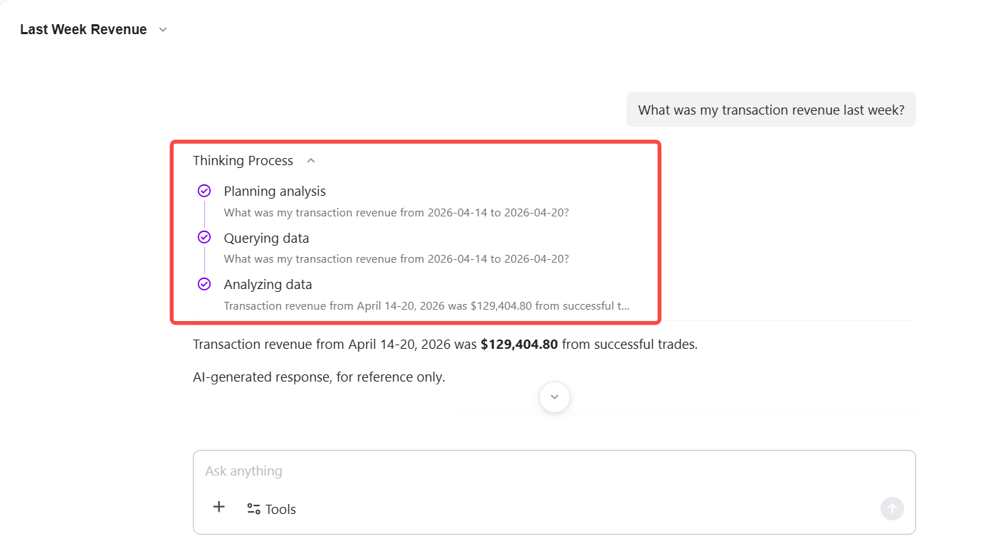 Data analysis queries display a thinking process so merchants can follow the progress. Status indicators are automatically replaced once results are ready.