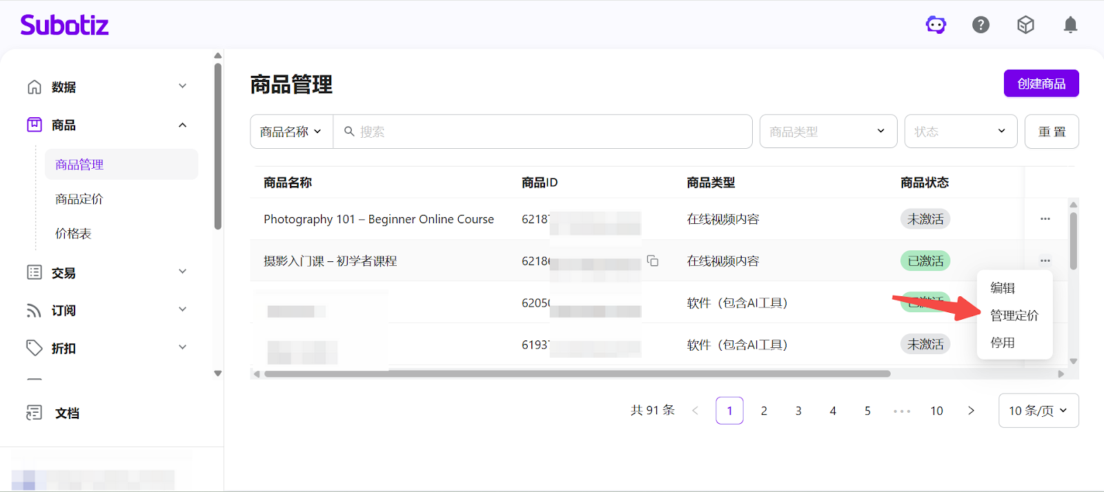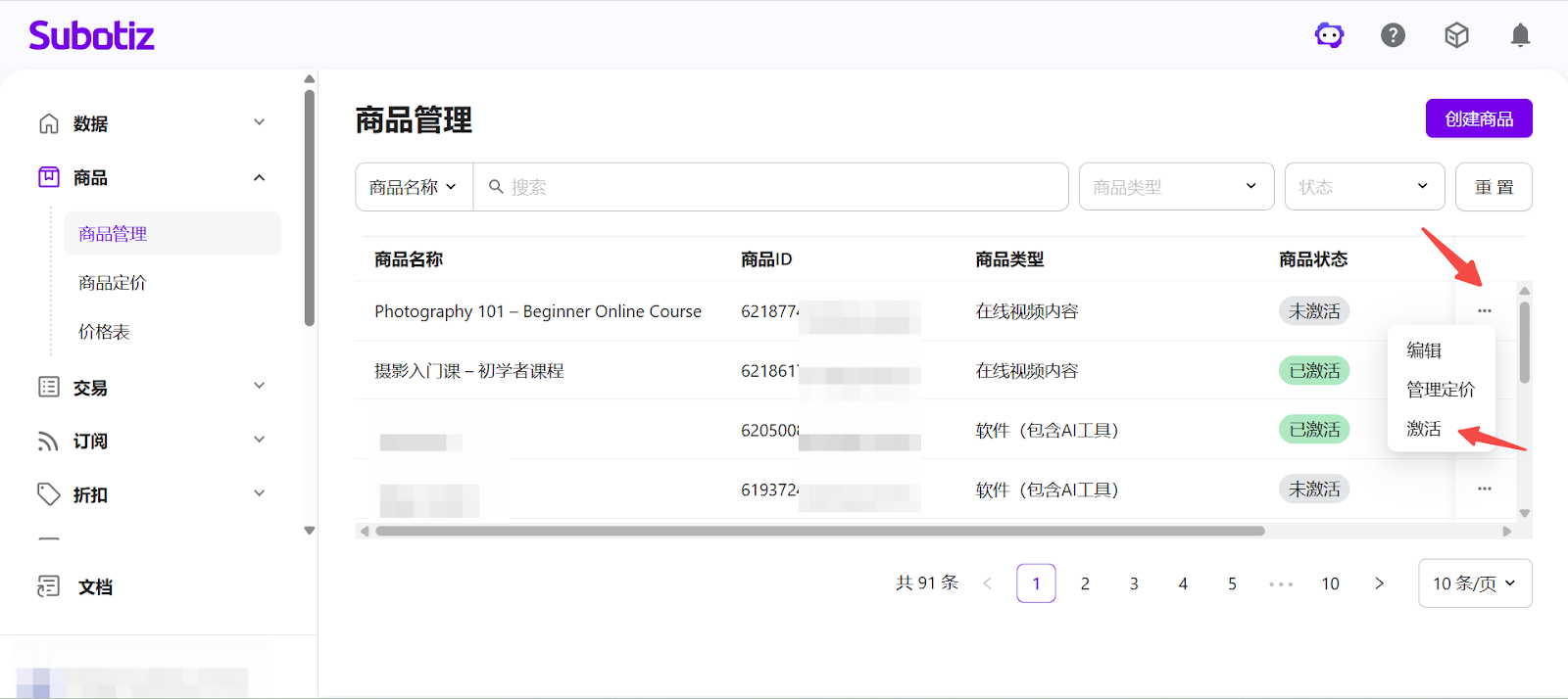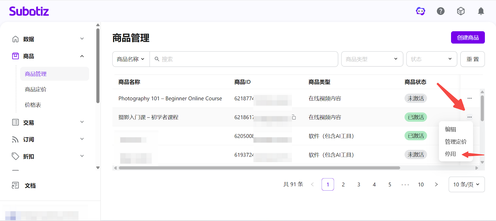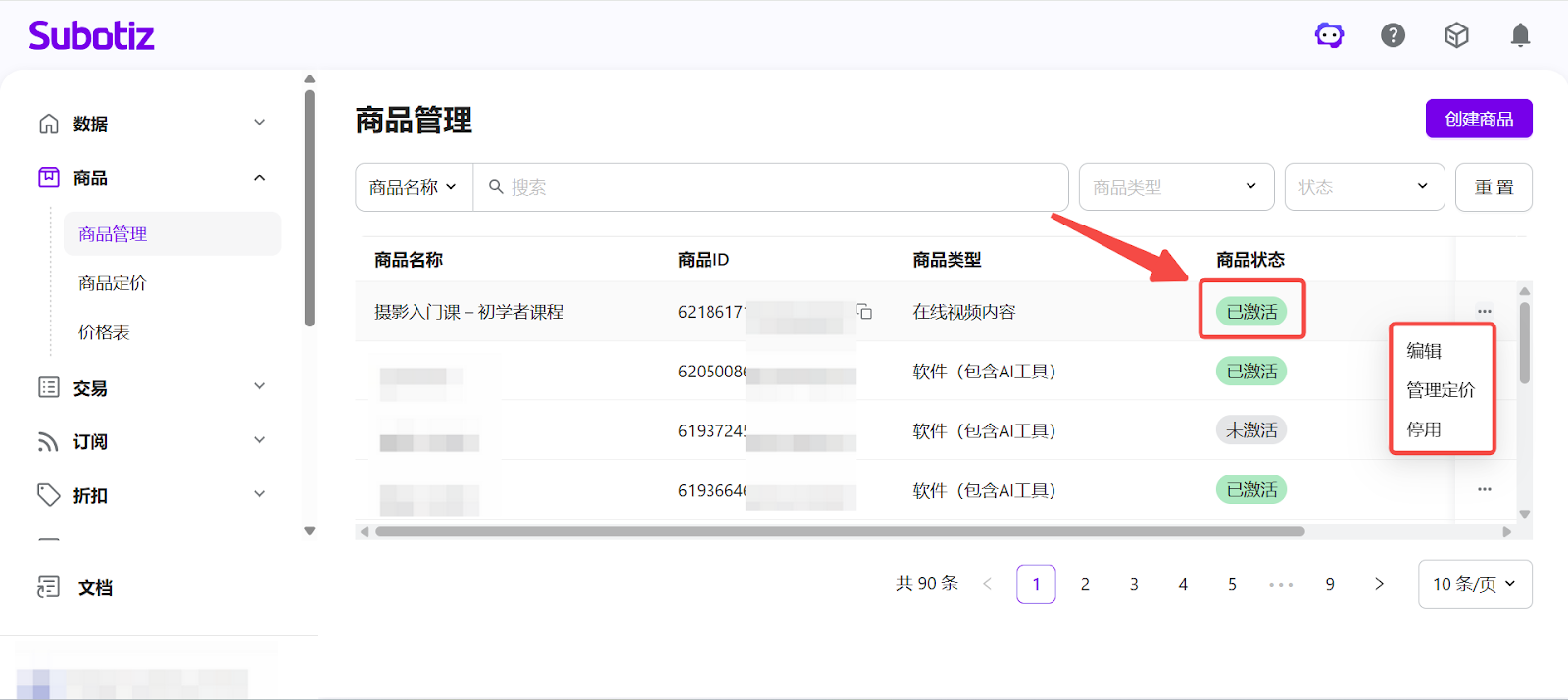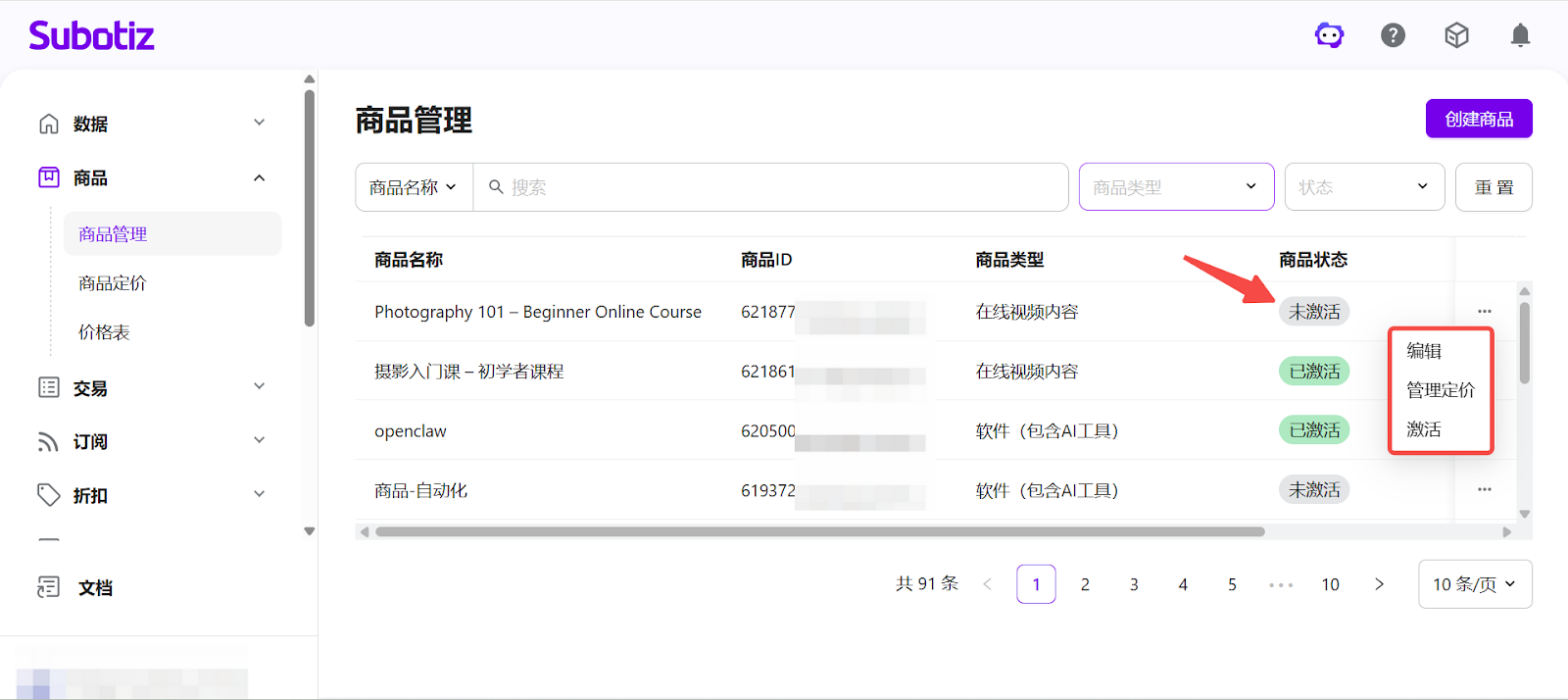 在 Subotiz 平台中,商品管理 页面用于集中查看和管理所有已创建的商品。商户可以通过商品列表了解 商品状态,并对商品进行编辑、激活、停用或删除等操作。通过合理管理商品状态,可以确保商品能够正常参与定价配置与结账流程。