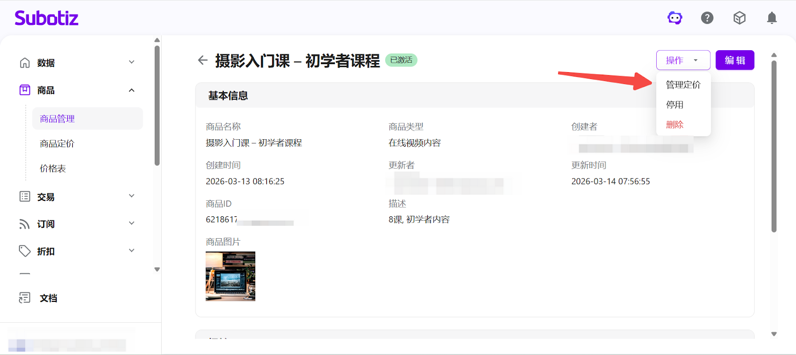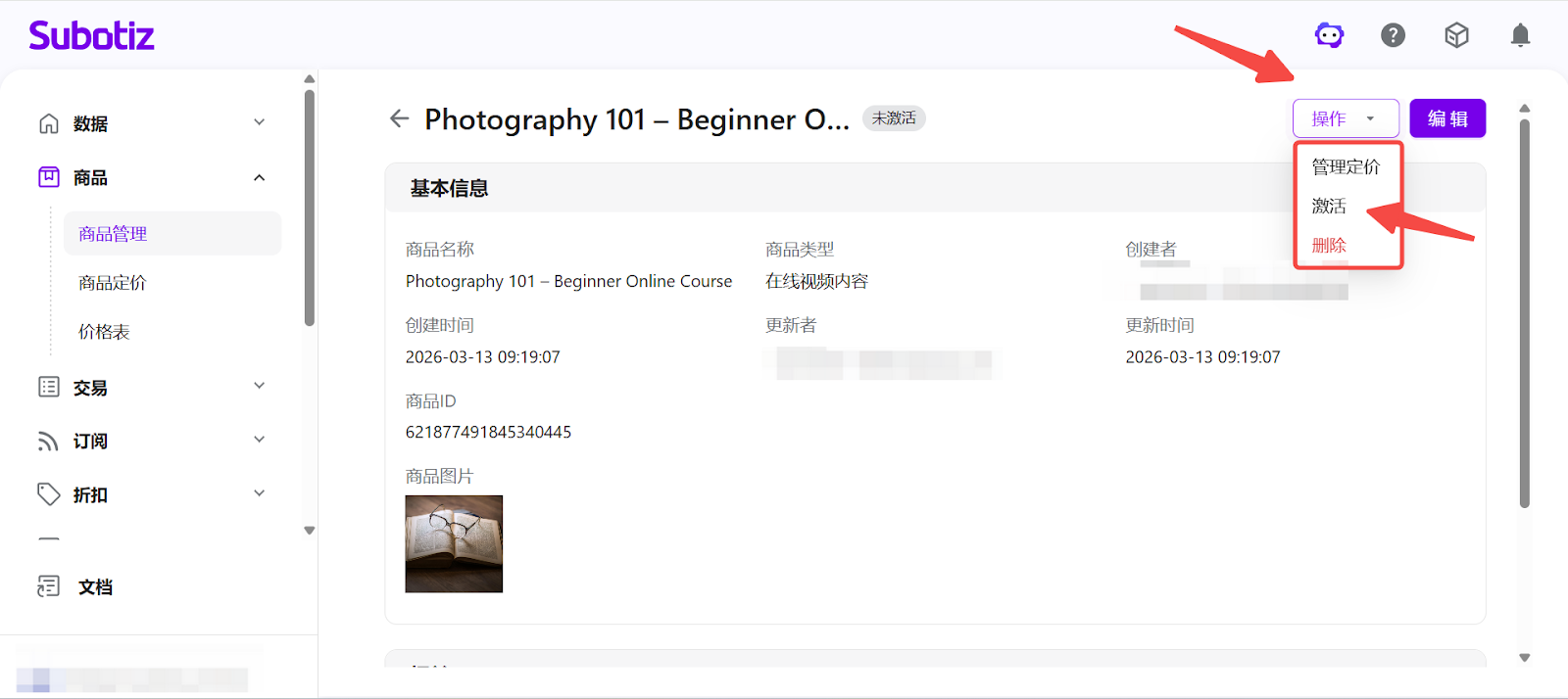 - 激活商品: 若商品当前为 未激活 状态,可以在商品详情页面点击 操作 > 激活。激活后,该商品即可用于创建定价方案并参与结账流程。