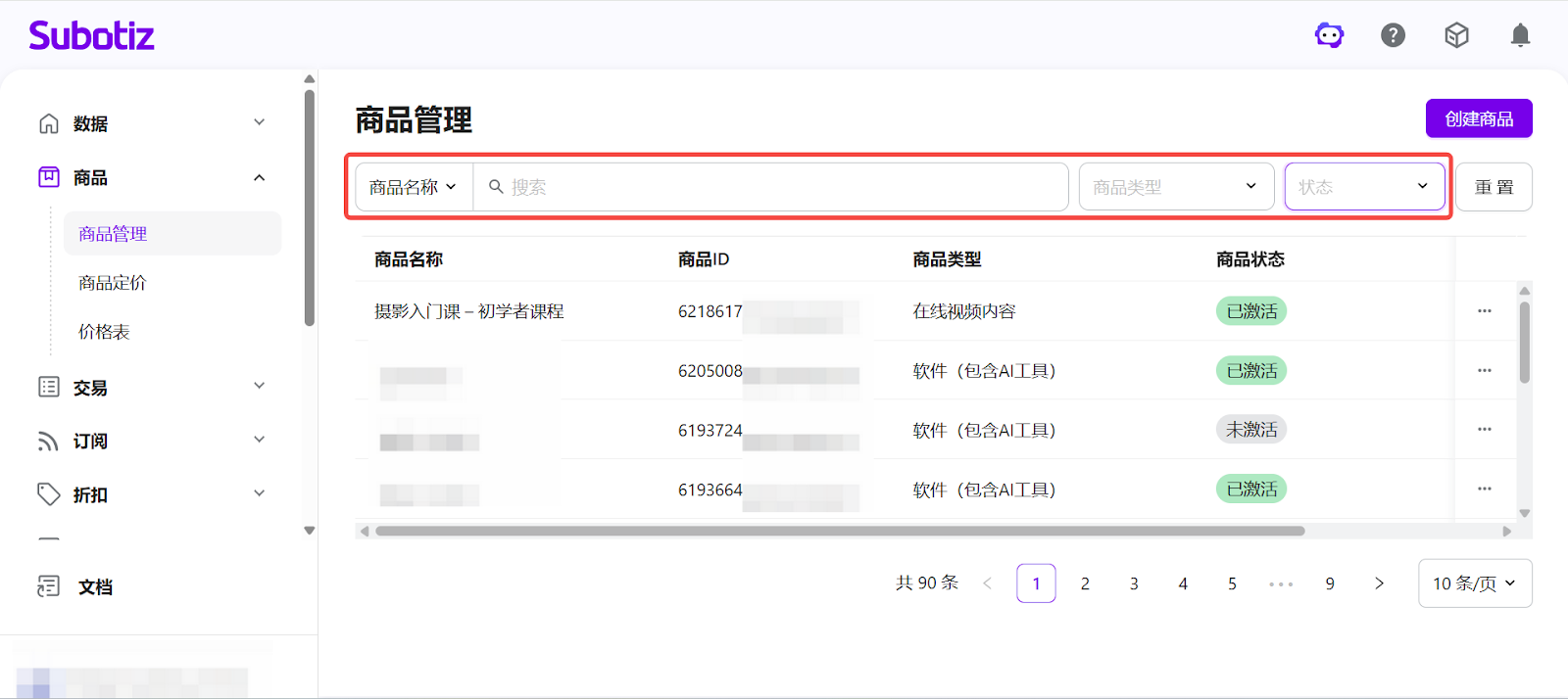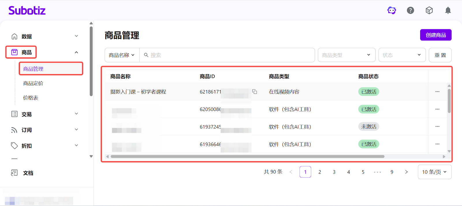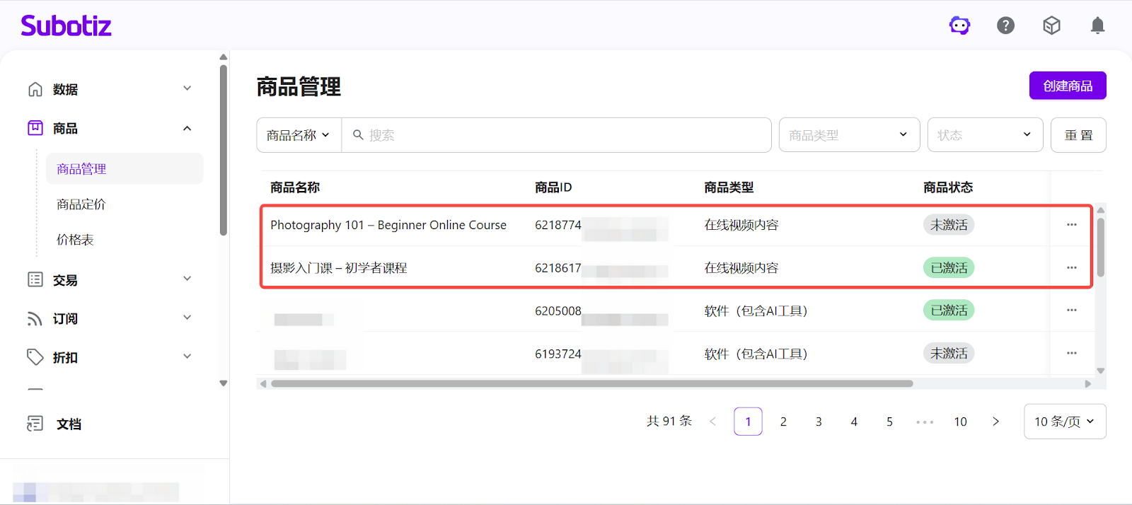 - 进入商品列表:登录 Subotiz 后台,进入 商品 > 商品管理,即可查看所有已创建的商品。商品列表中会显示以下信息: