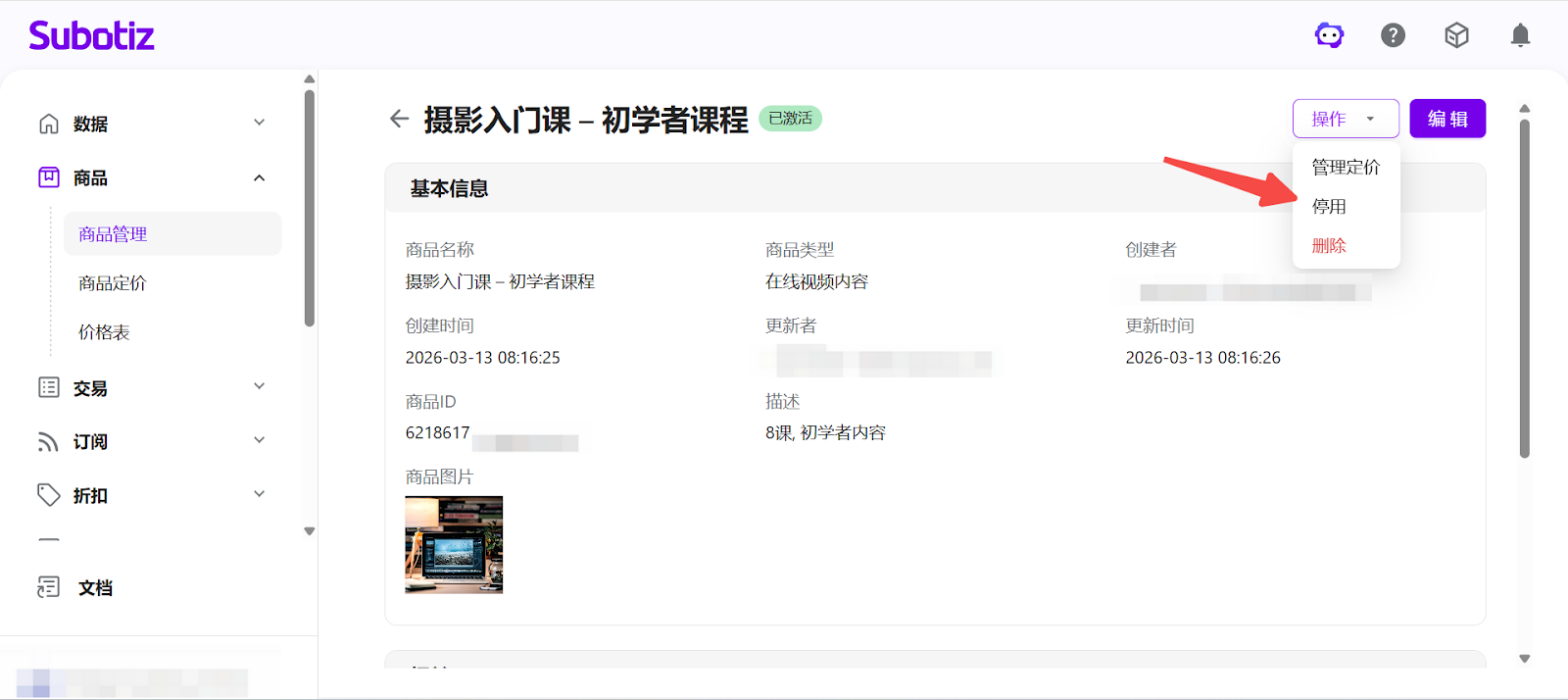 - 停用商品: 如果不再希望某个商品用于新的付款流程,可以对已激活商品执行 停用 操作。停用后: