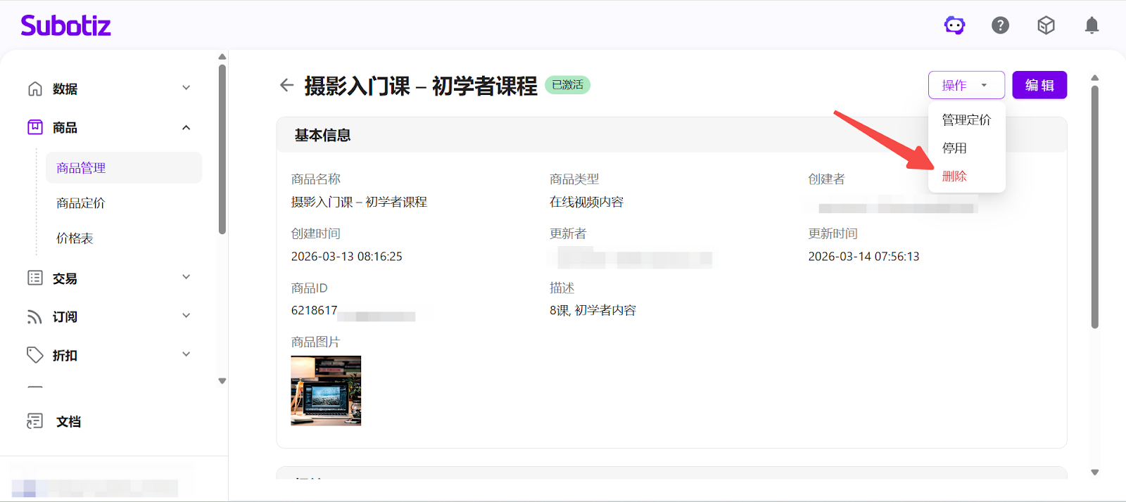 - 删除商品: 如果某个商品不再需要使用,可以在商品详情页面点击 操作 > 删除。删除后: