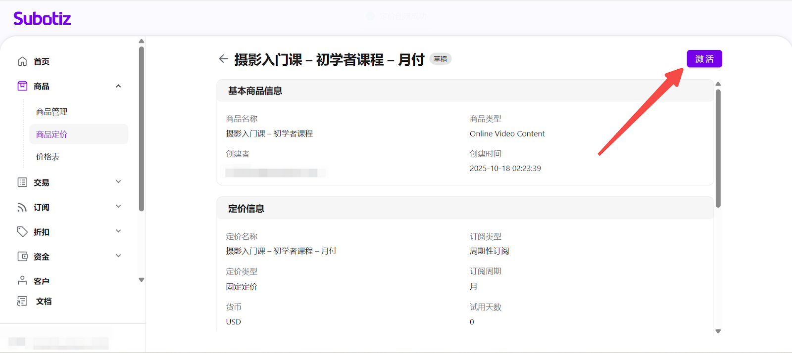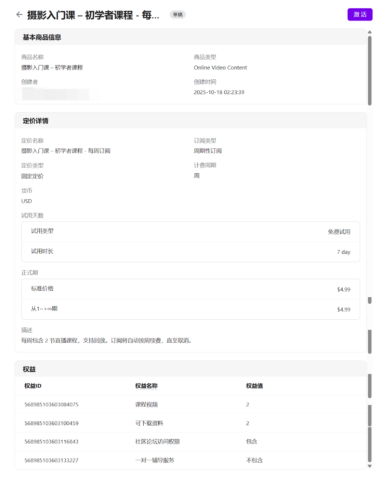 - 保存并激活: 点击 提交,进入详情页后点击 激活。