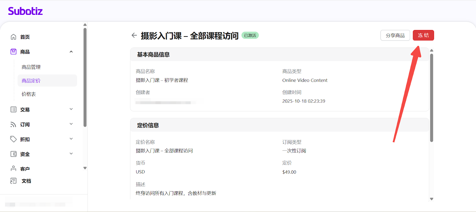 - 点击冻结:在定价详情页点击 冻结,即可下架该方案,结算和开票中将不再展示。