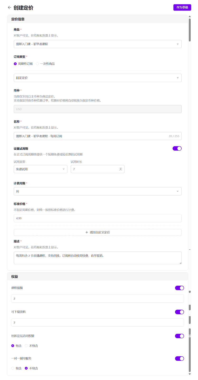 为同一个商品配置多种定价方案,可以帮助您满足不同用户的购买需求,提供更灵活的订阅方式。在设置方案前,请确保商品已激活,配置清晰的命名与权益区分,并定期检查定价配置,保持结账流程顺畅一致。