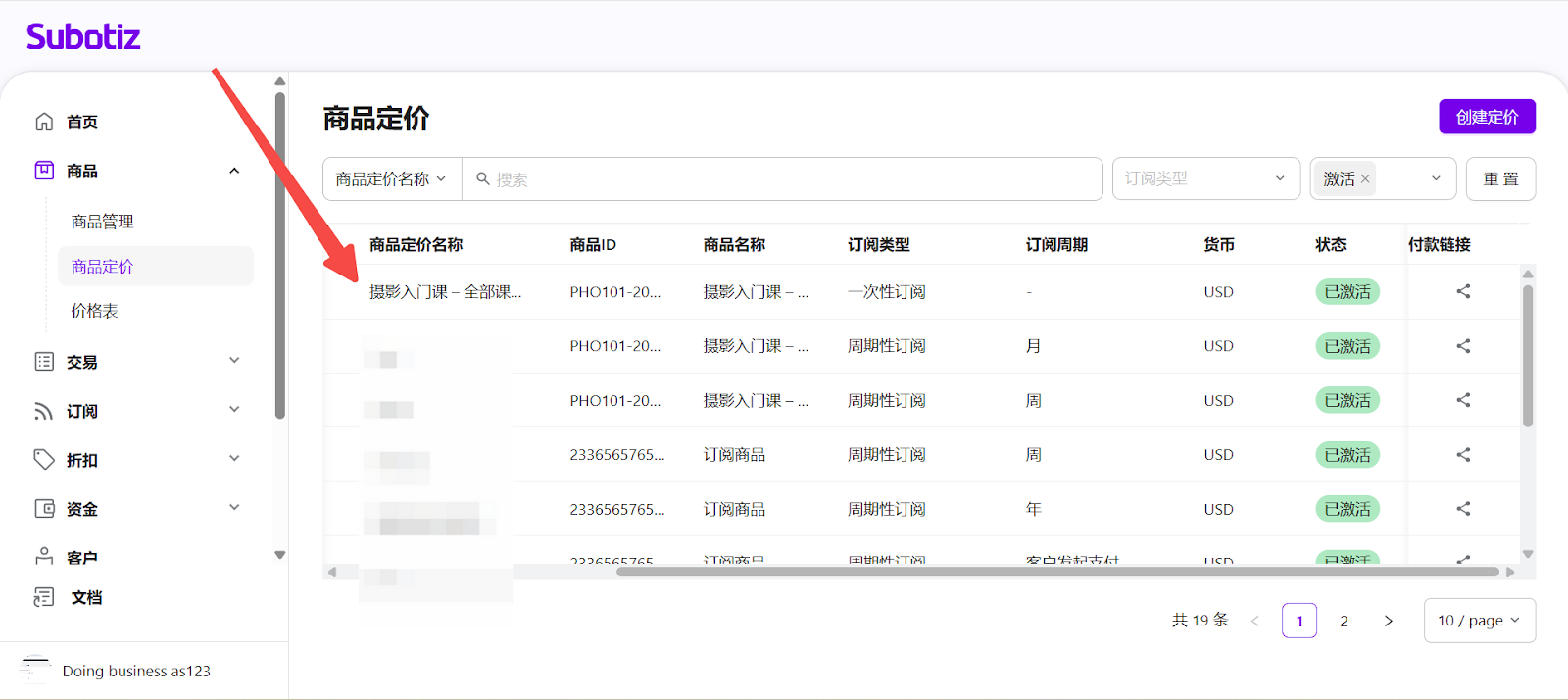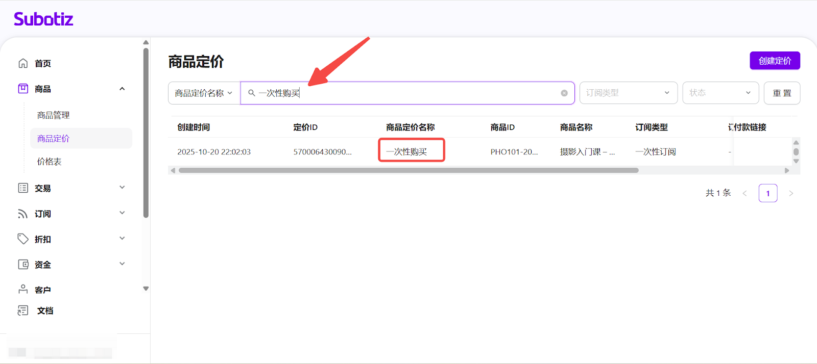 - 筛选商品: 在 商品 > 商品定价 页面,通过商品筛选确认所有方案已创建。结算和发票中会分别显示: