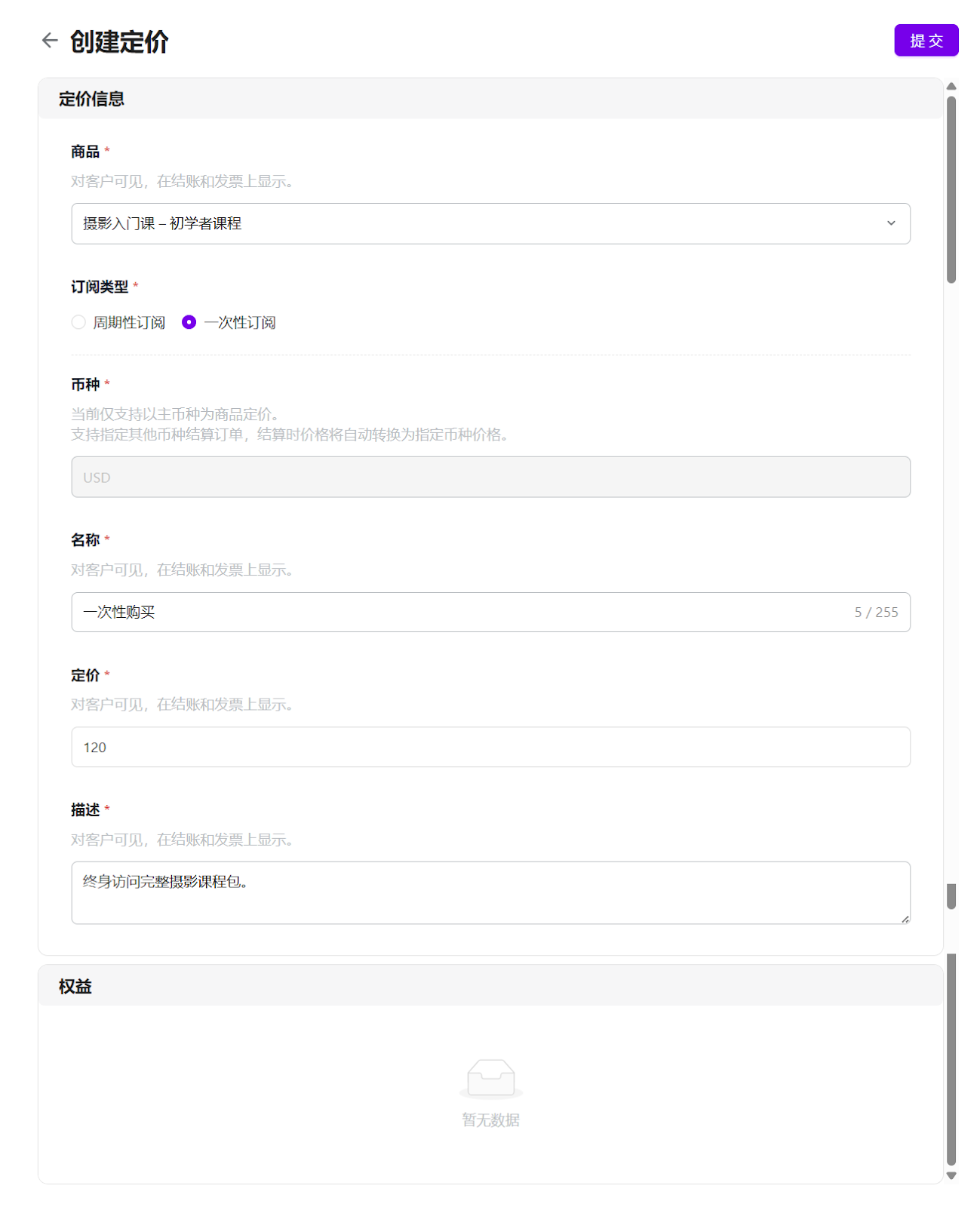 - 新建定价: 在 商品定价 页面点击 创建定价,选择同一商品。
