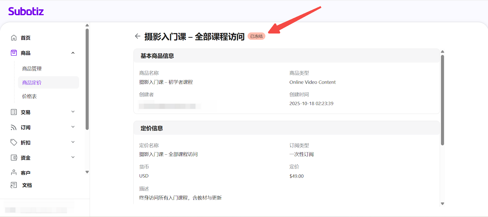 - 确认状态变更: 冻结后状态将显示为 已冻结。冻结后的方案无法恢复激活,若后续仍需使用,请重新创建一条新的定价方案。
