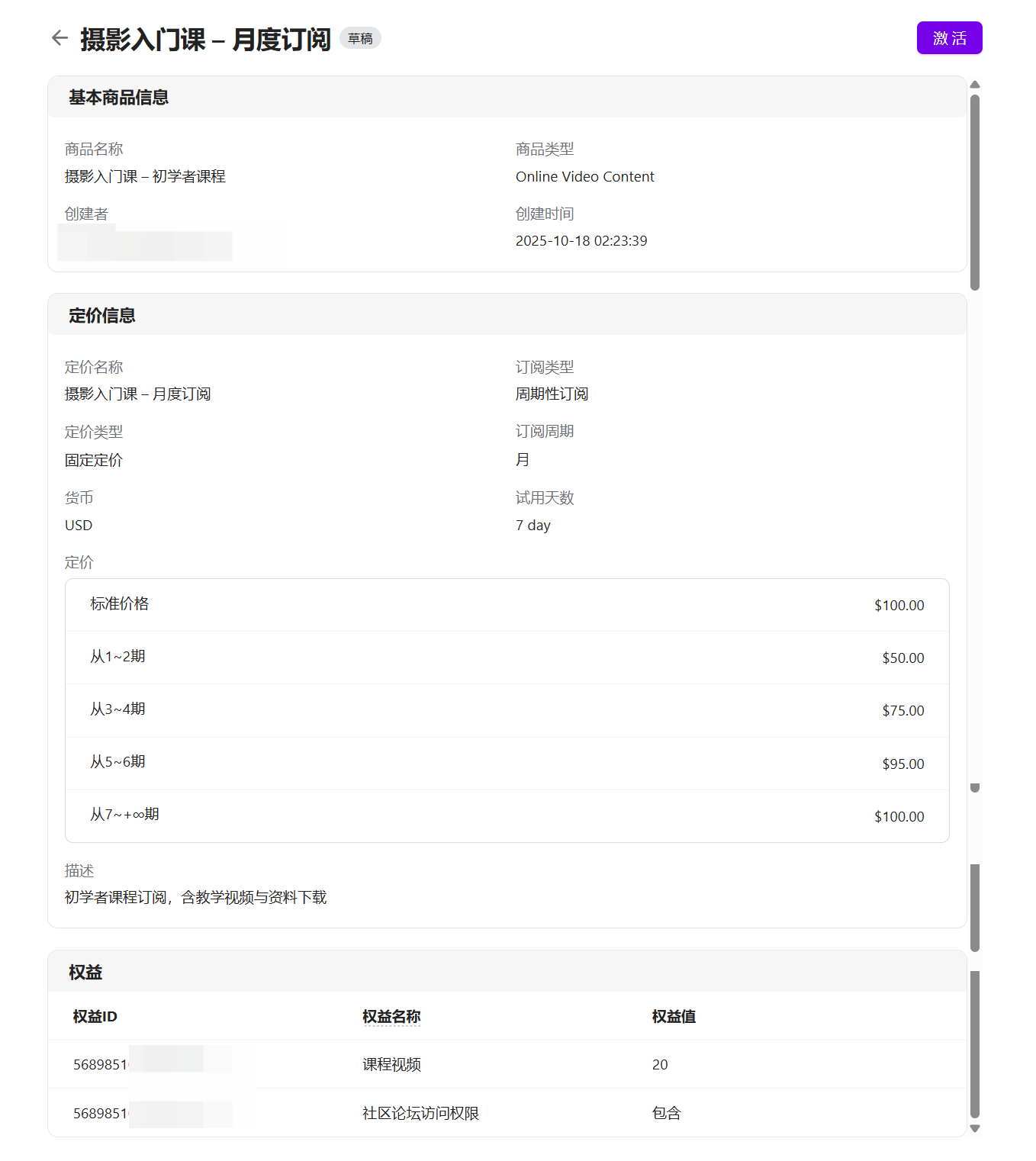 - 查看方案详情:点击方案名称进入详情页,可查看完整配置信息,包括订阅周期、试用期、币种及价格规则。