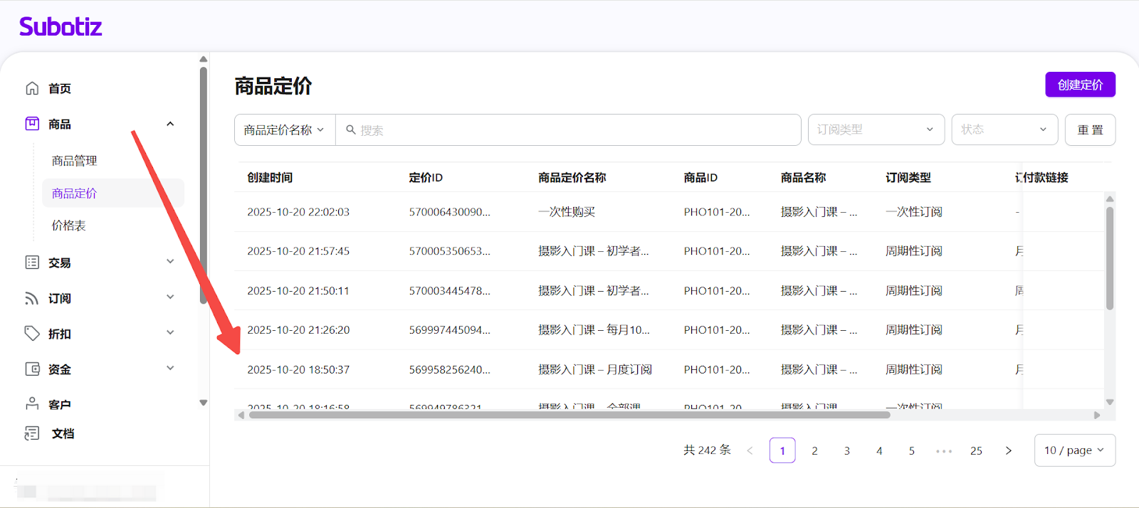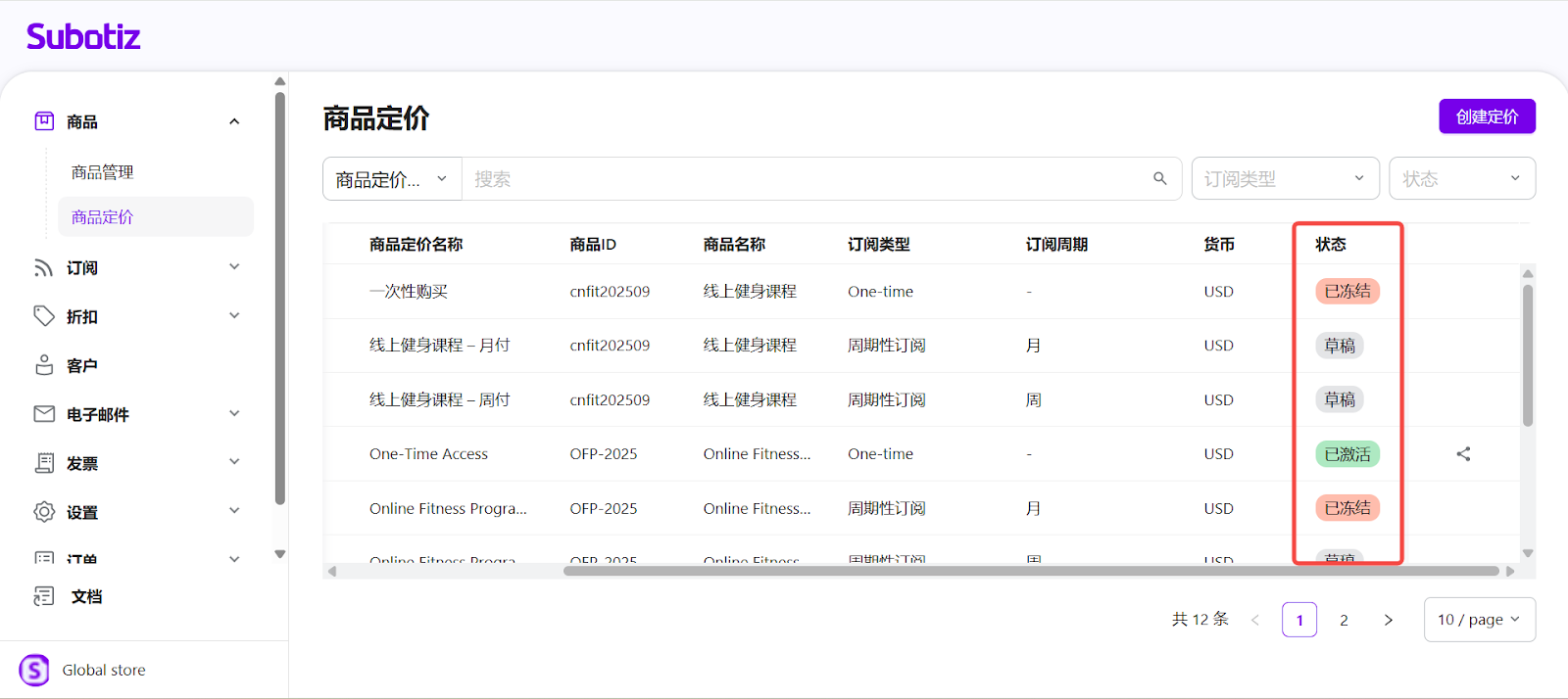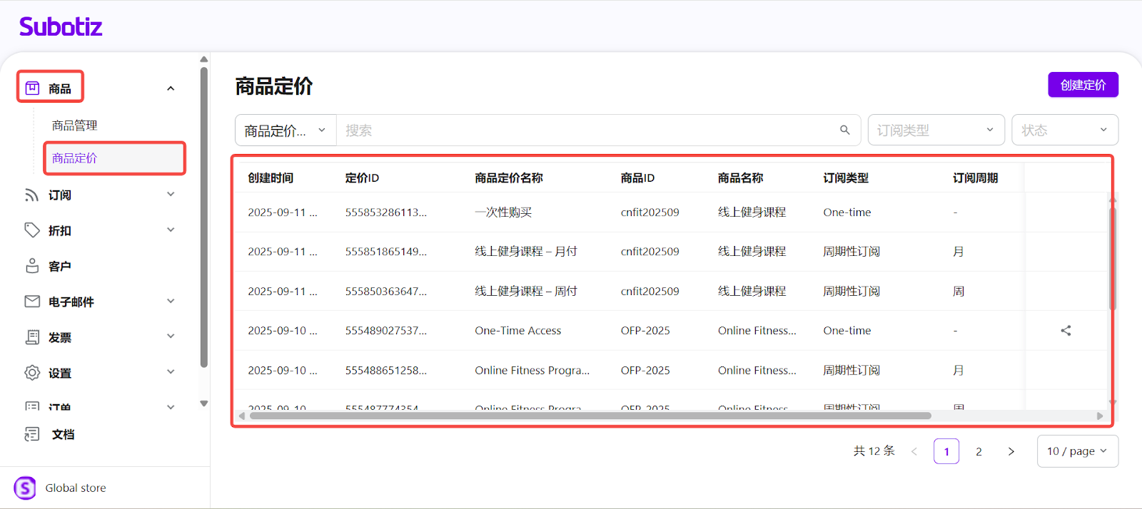 - 打开定价列表:登录 Subotiz 后台,进入 商品 > 商品定价。列表中会显示定价名称、订阅类型、订阅周期和当前状态,帮助商家快速了解方案情况。