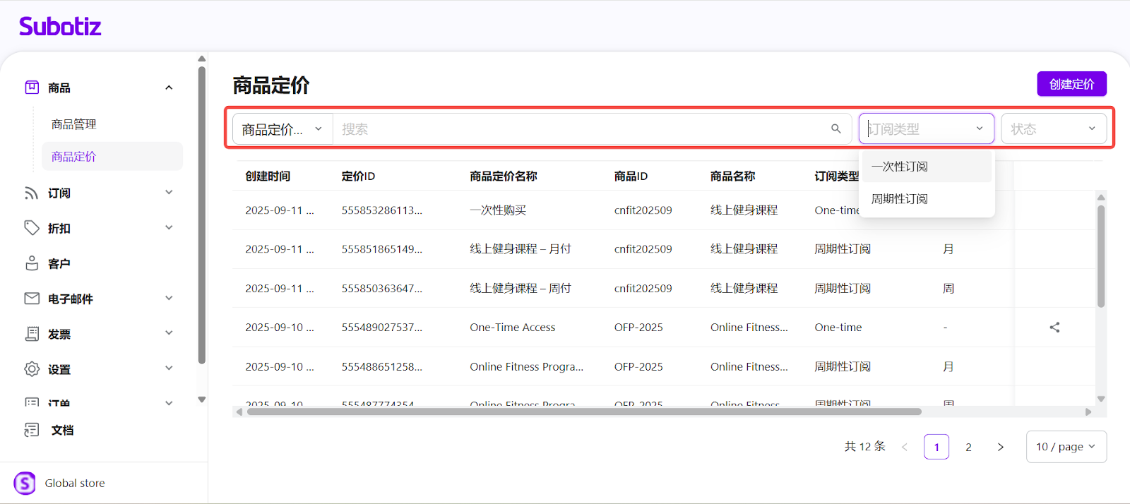 Subotiz 的 商品定价面板 为商家提供统一管理入口,可集中查看所有定价方案。无论是 一次性订阅 还是 周期性订阅,都可以在此完成搜索、筛选与状态管理,方便快速更新和维护商品目录。