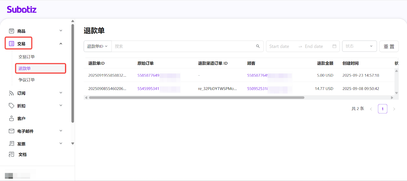 操作路径:进入 Subotiz 后台 交易 > 退款单。列表中会展示以下关键信息:退款单号、对应交易订单号、渠道退款号、顾客 ID、退款金额、创建时间、当前状态及备注说明。