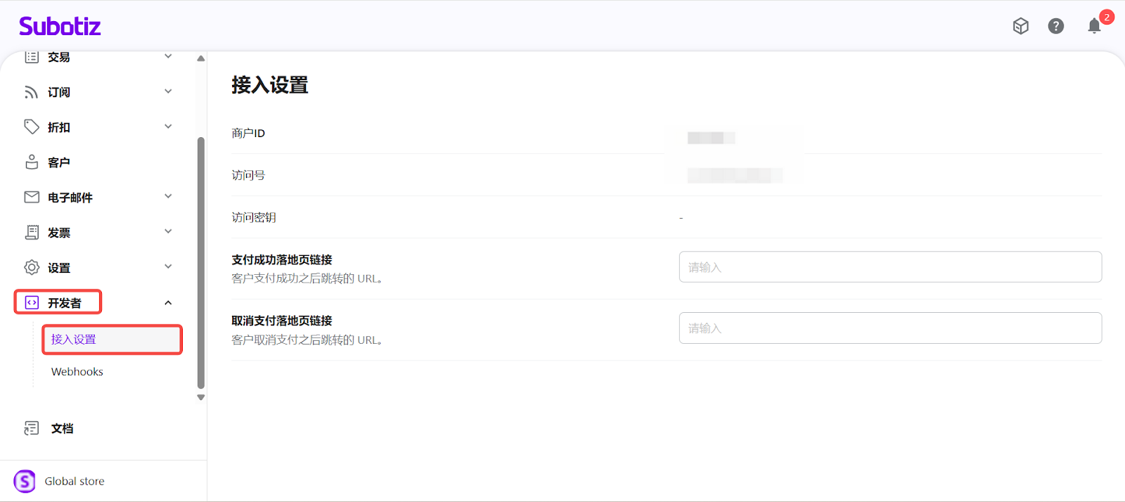 - 进入开发者页面:登录 Subotiz 后台,前往 开发者 > 接入设置。