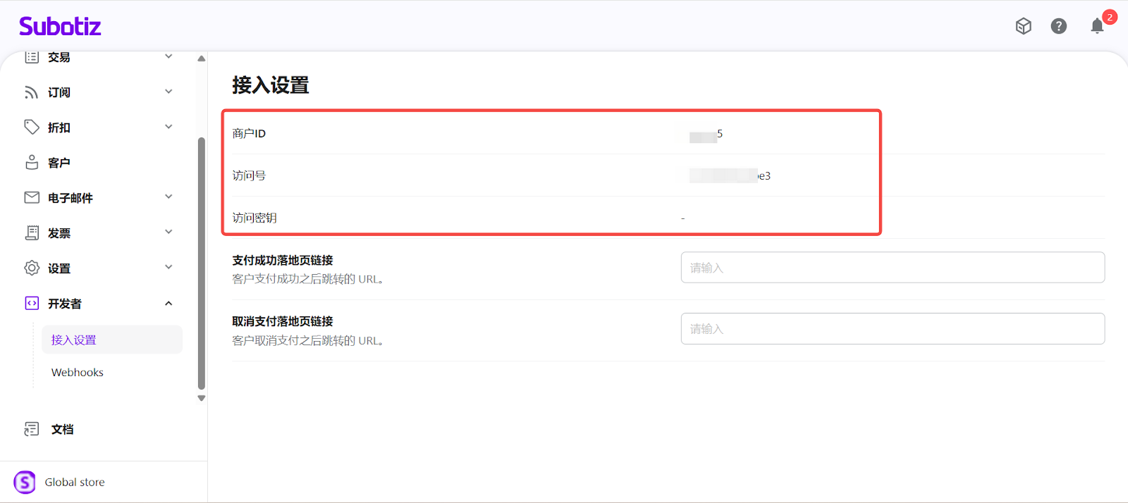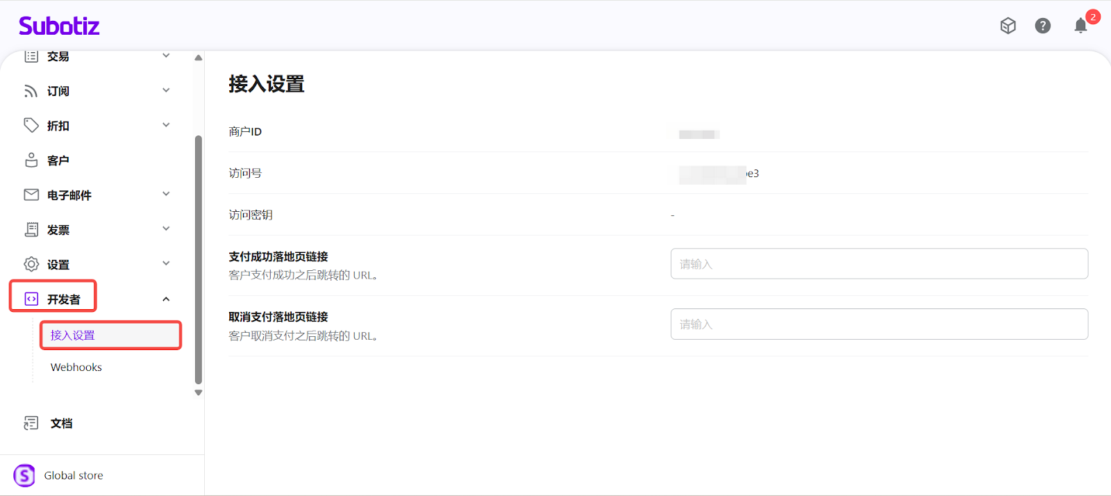 - 进入开发者页面:登录 Subotiz 后台,前往 开发者 > 接入设置。