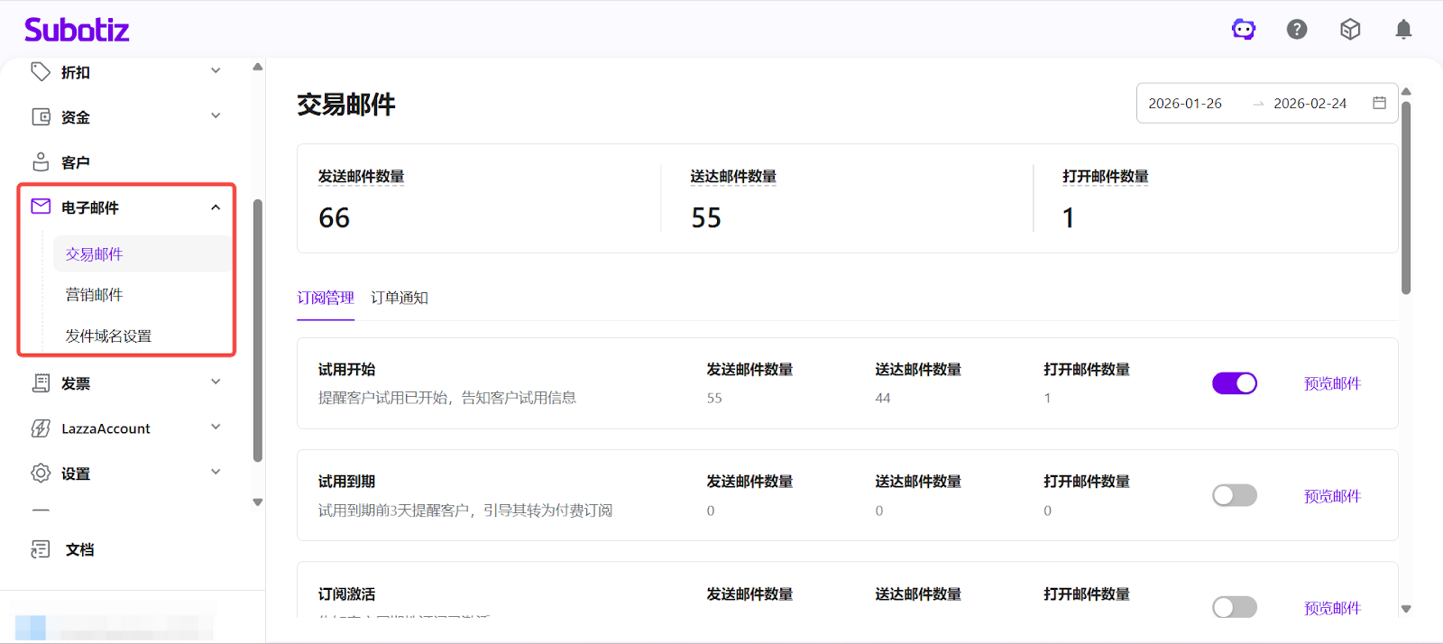 - 交易邮件:自动发送试用开始、续费、支付结果及订阅变更等通知。