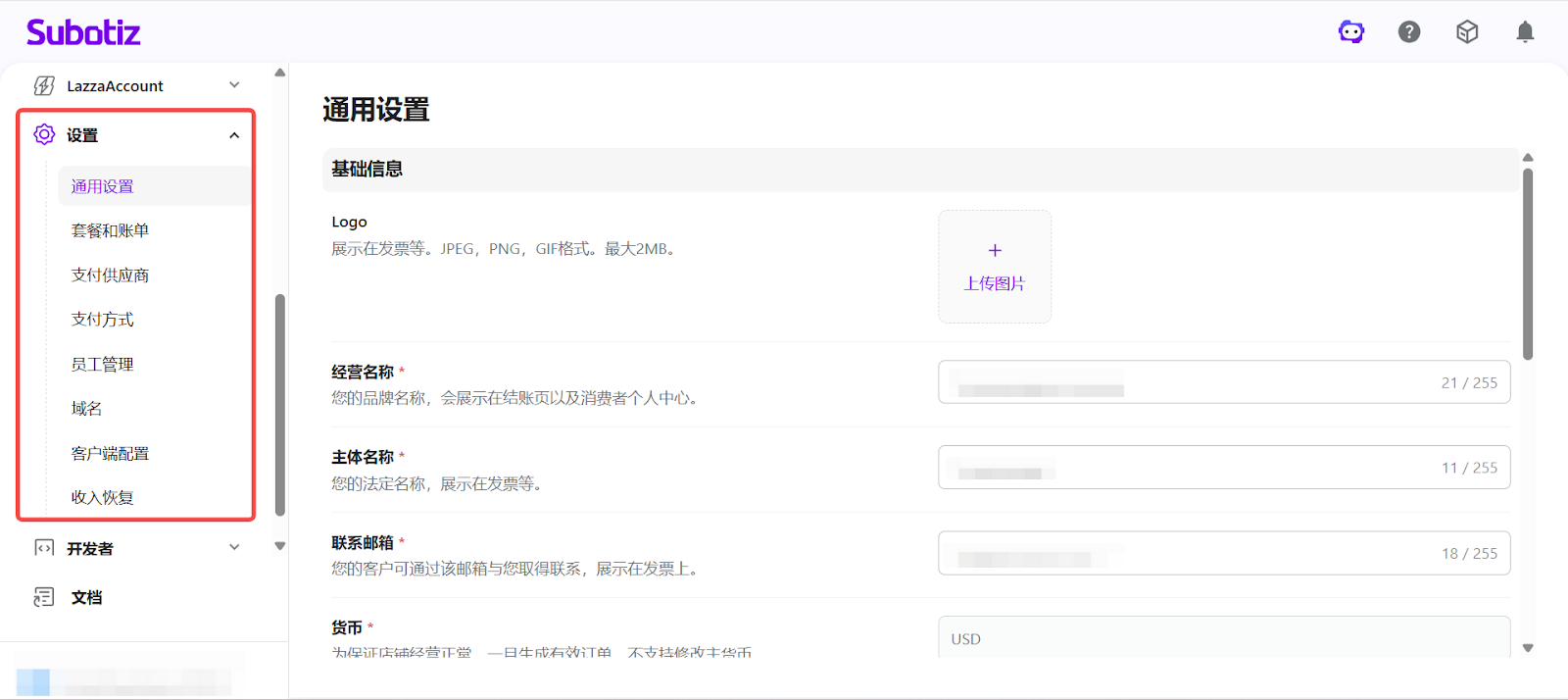 - 通用设置:管理品牌标识、商户名称及法定主体信息。