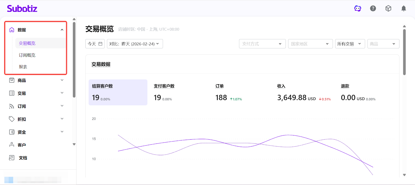 - 交易概览:展示订单数、收入与退款等核心交易指标。