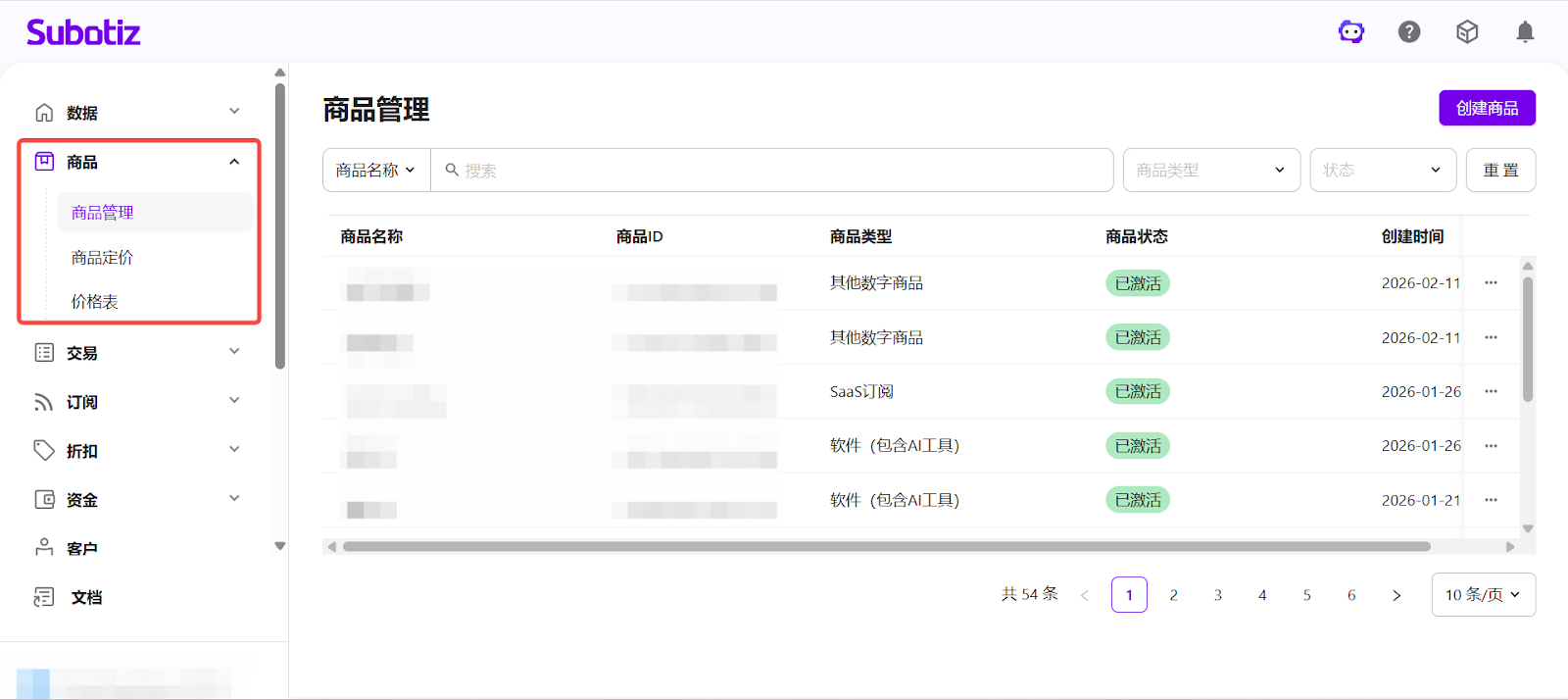 - 商品管理:创建和管理商品。每个商品作为定价方案与订阅的基础。