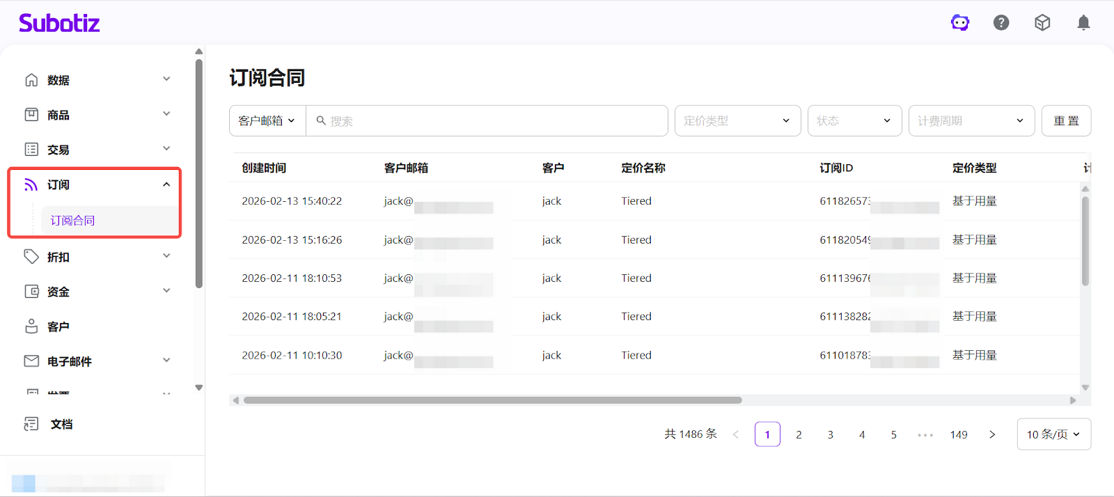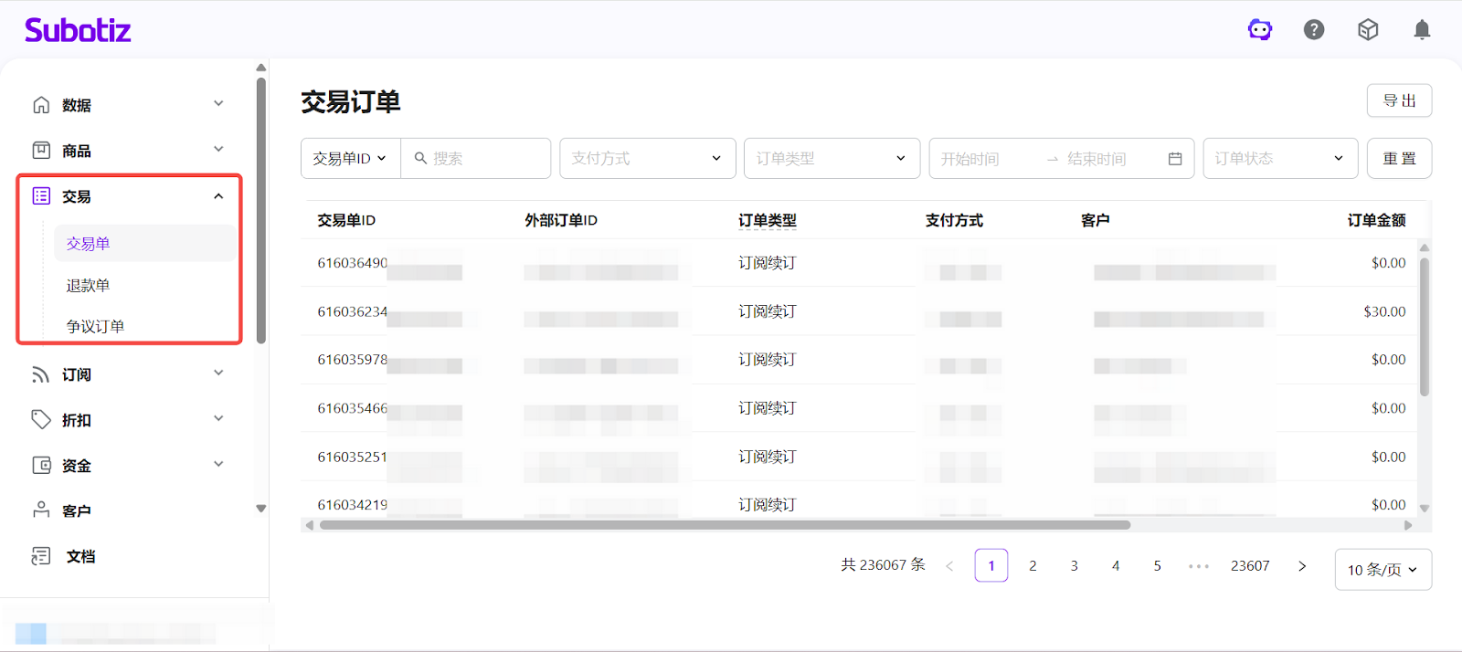 - 交易订单:查看所有订阅创建、续费及一次性收费记录,包含支付状态与交易明细。