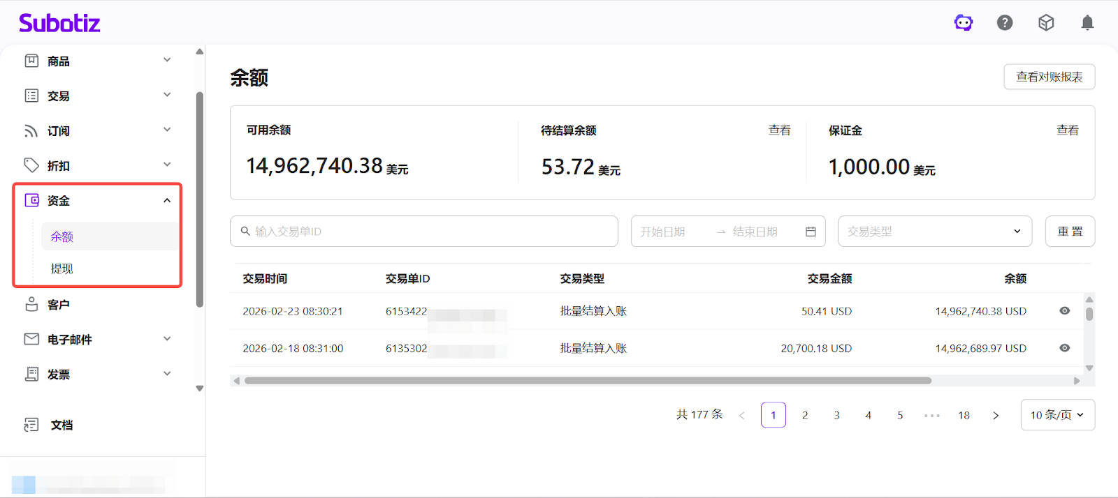 - 提现:展示由 Subotiz 向绑定银行账户发起的结算转账记录。