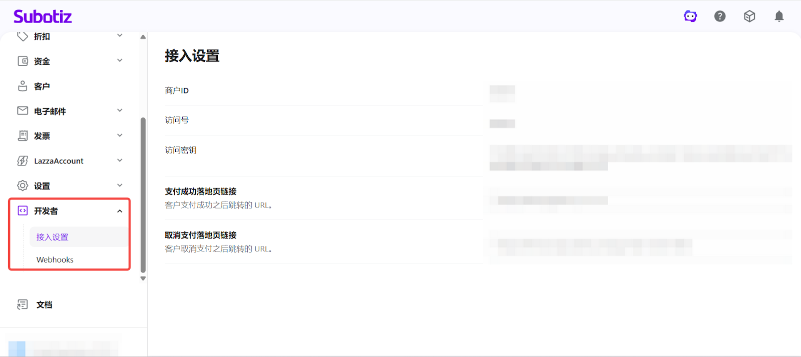 - 接入设置:展示商户ID、访问号与访问密钥等核心凭证,并可设置支付成功与取消后的跳转地址。