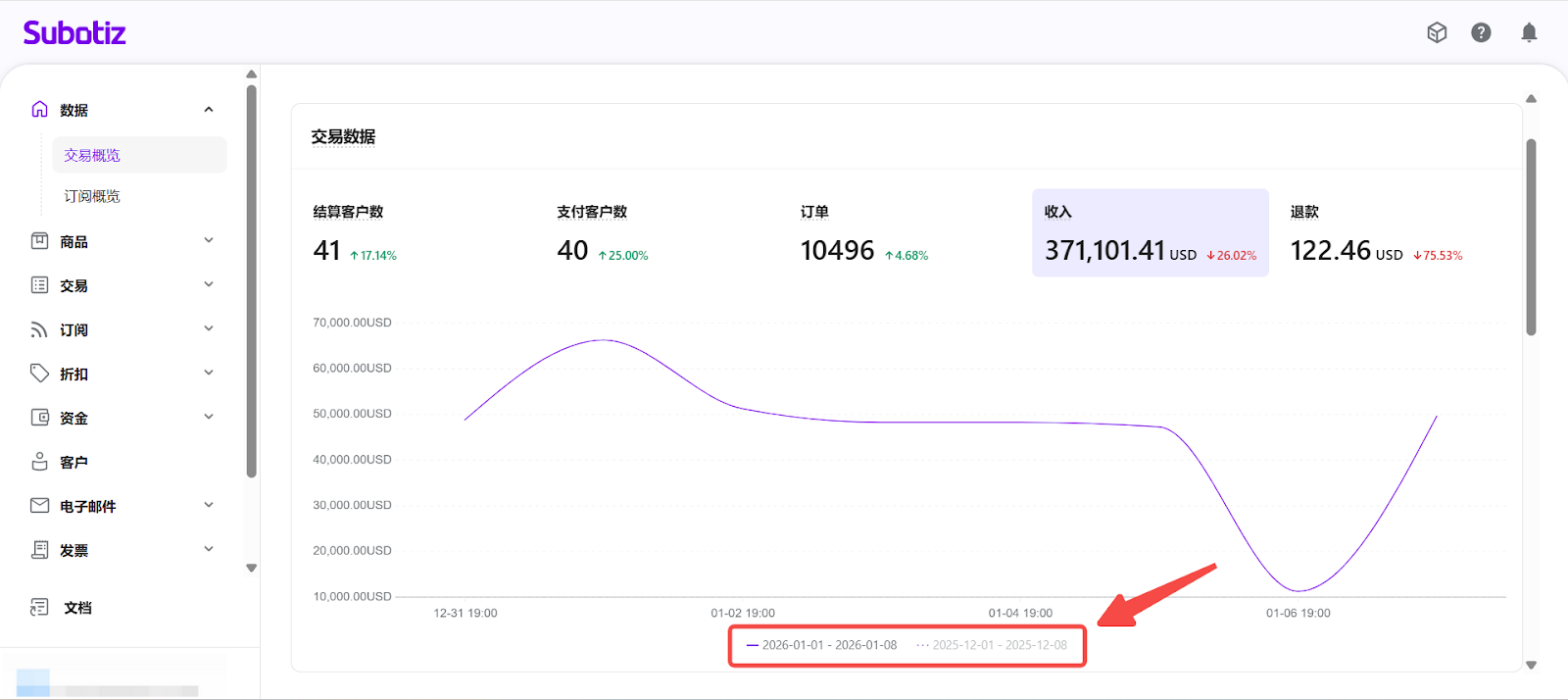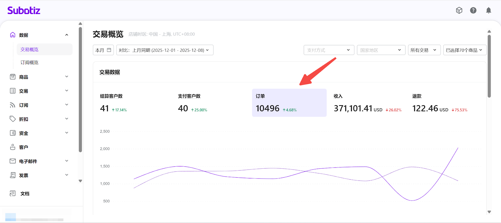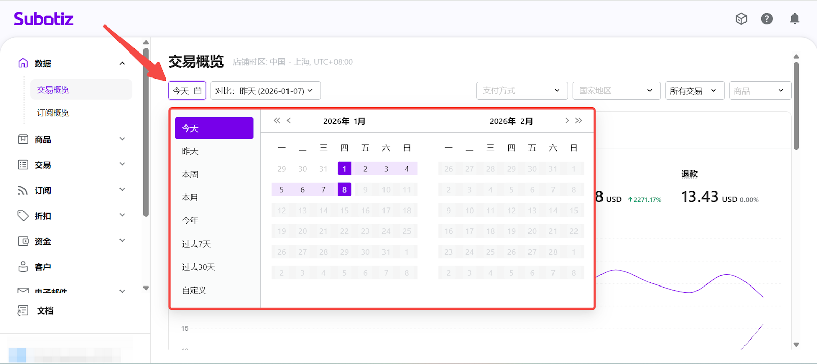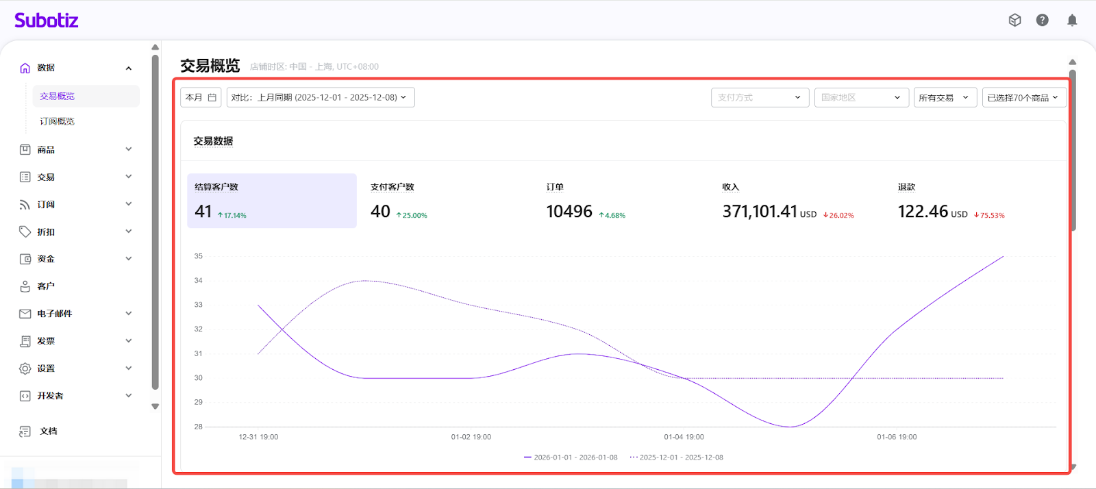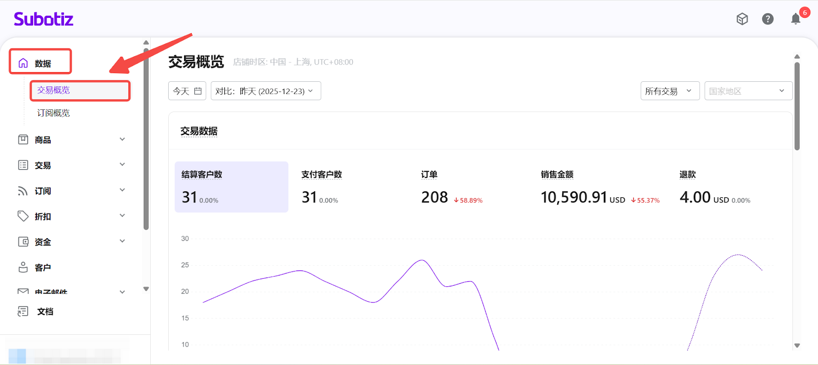 - 打开交易概览:在 Subotiz 后台,前往 数据 > 交易概览,进入交易数据分析页面。
