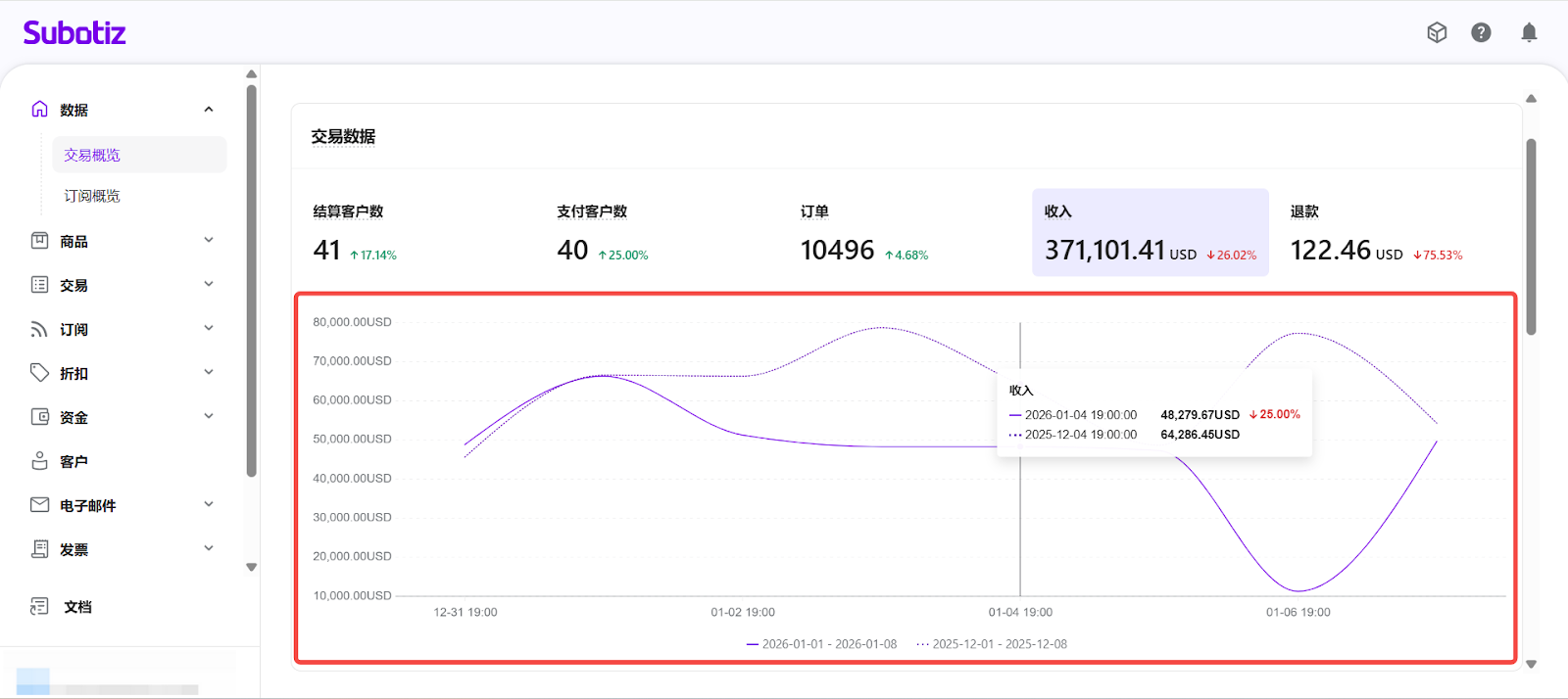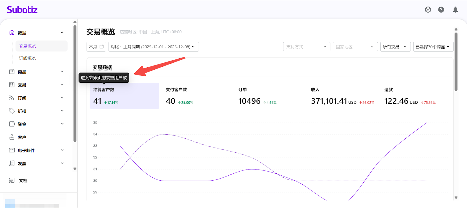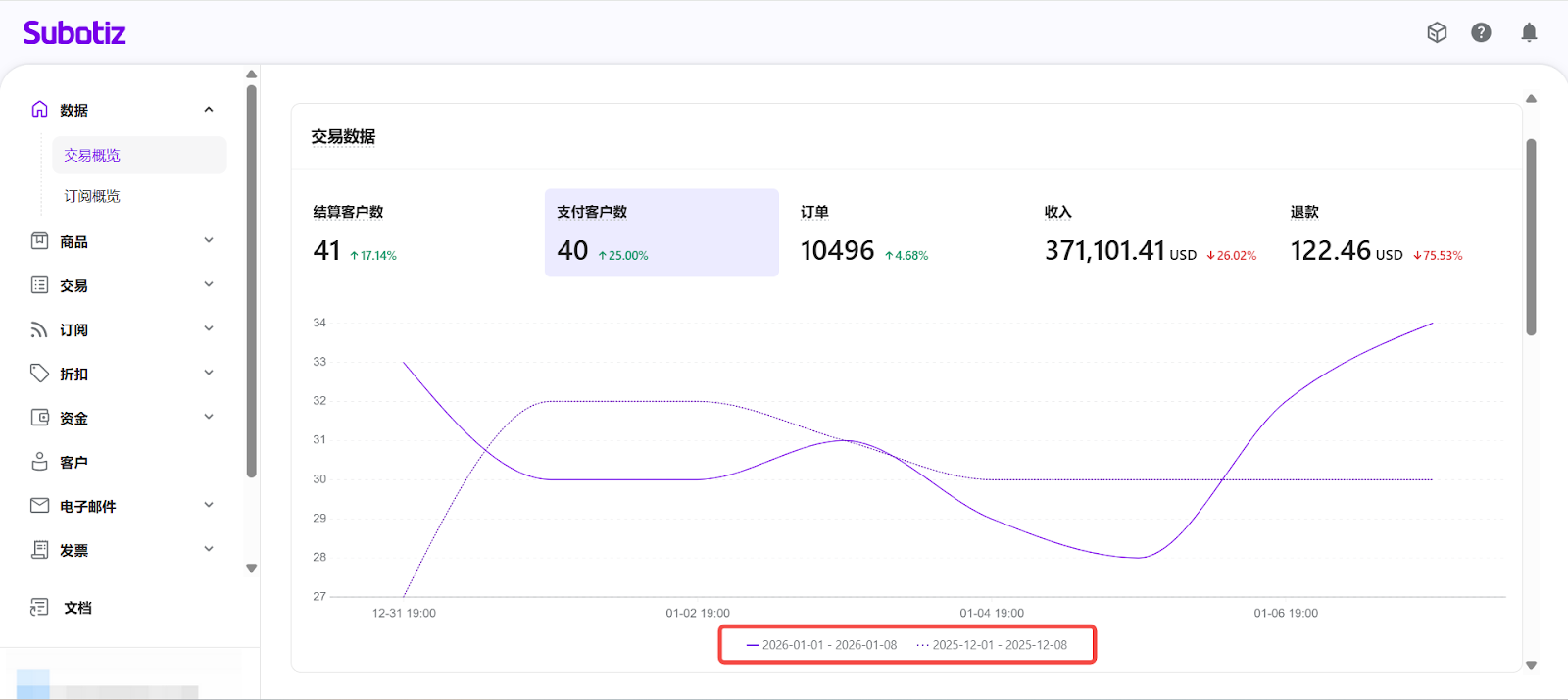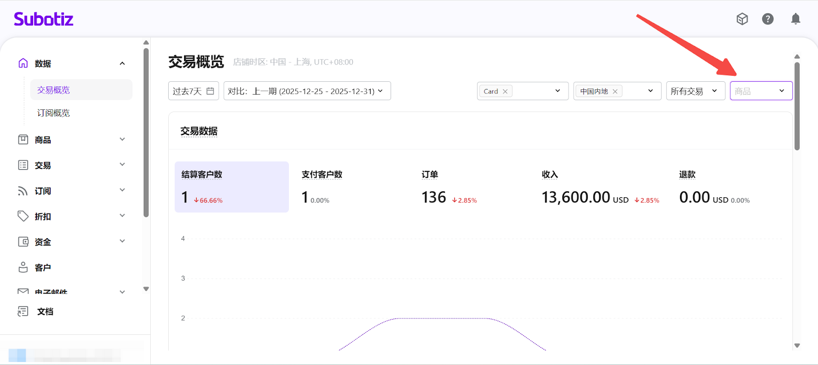 - 打开交易概览:在 Subotiz 后台,前往 数据 > 交易概览,进入交易数据分析页面。