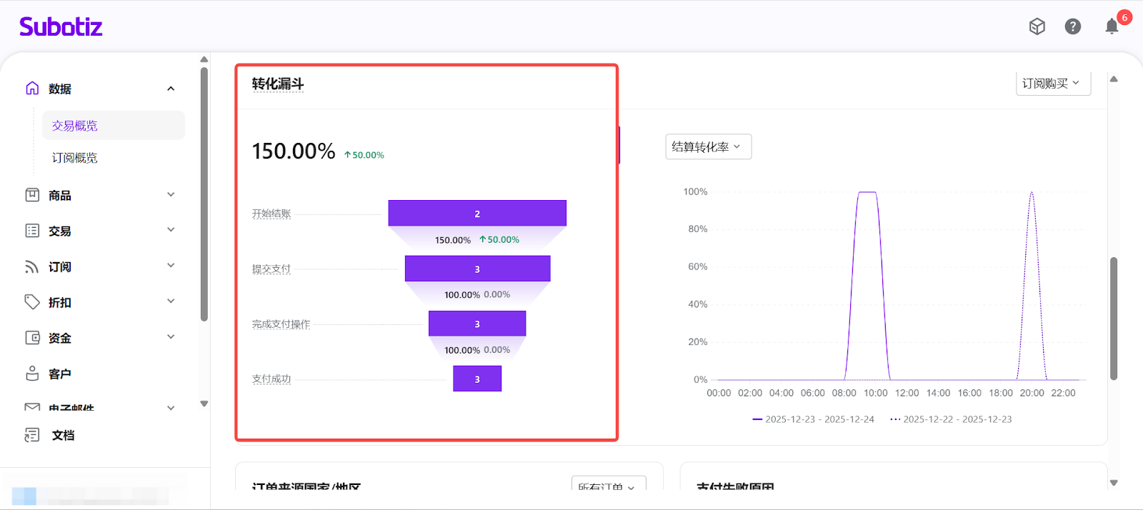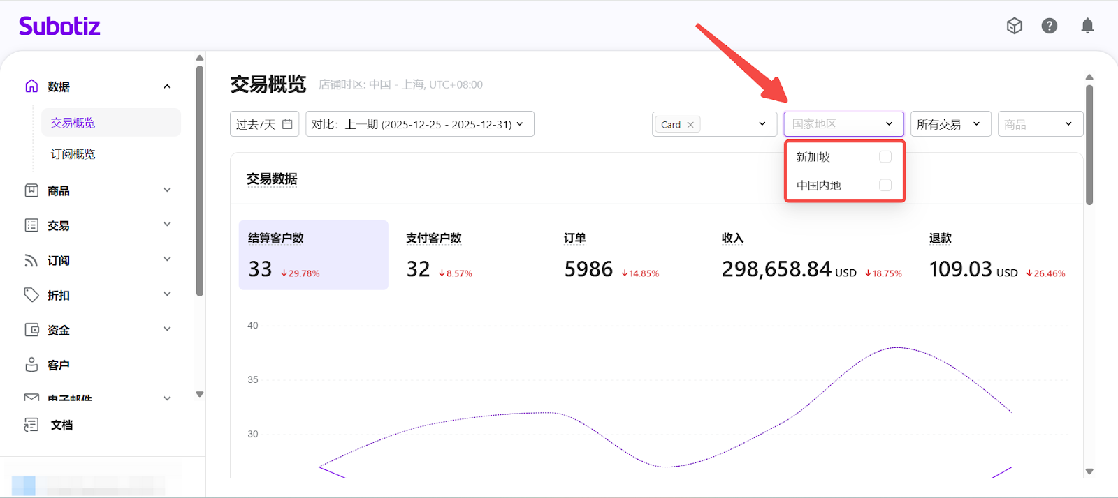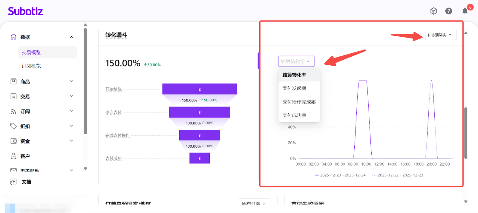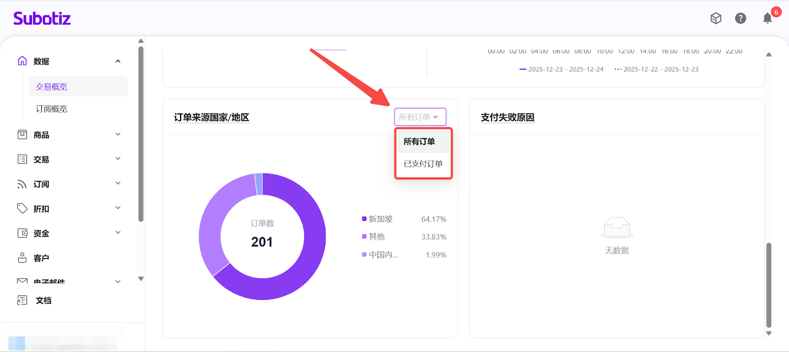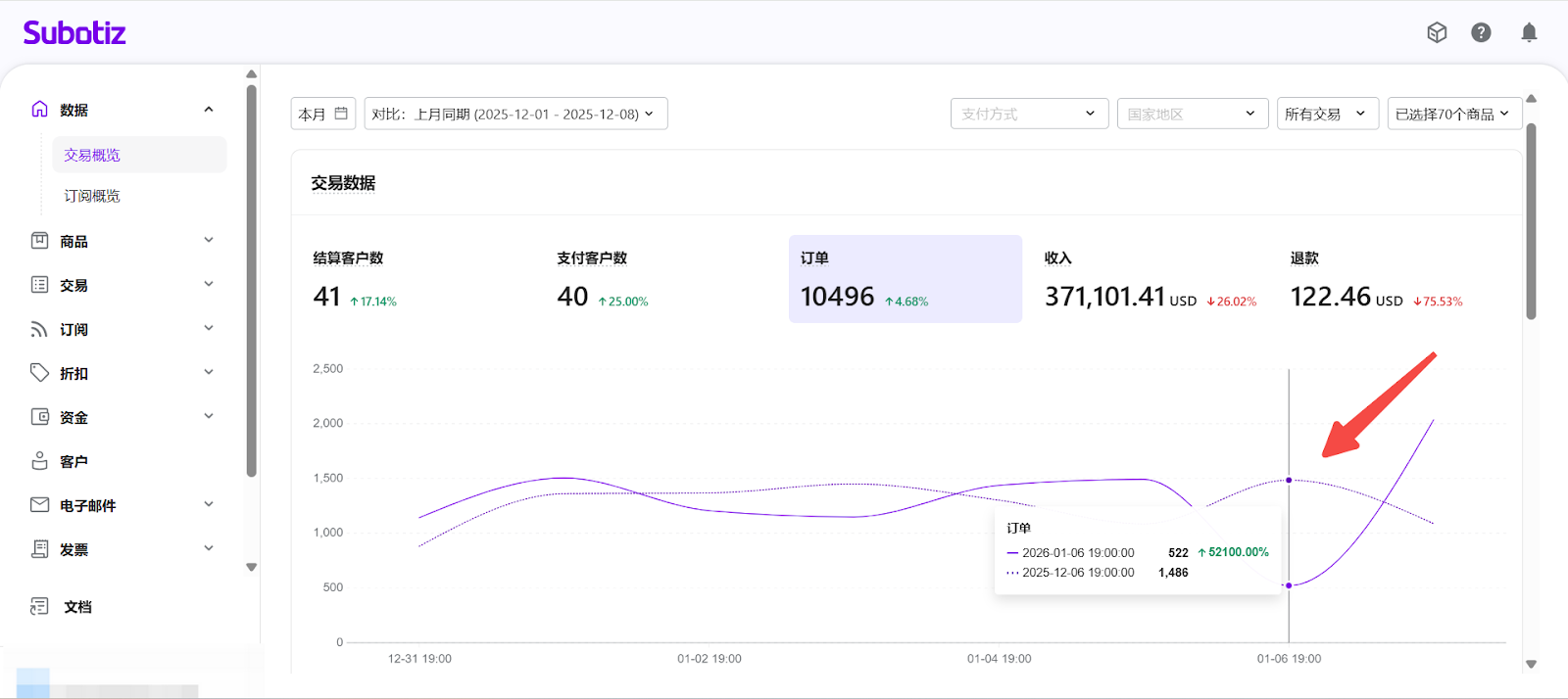 - 打开交易概览:在 Subotiz 后台,前往 数据 > 交易概览,进入交易数据分析页面。