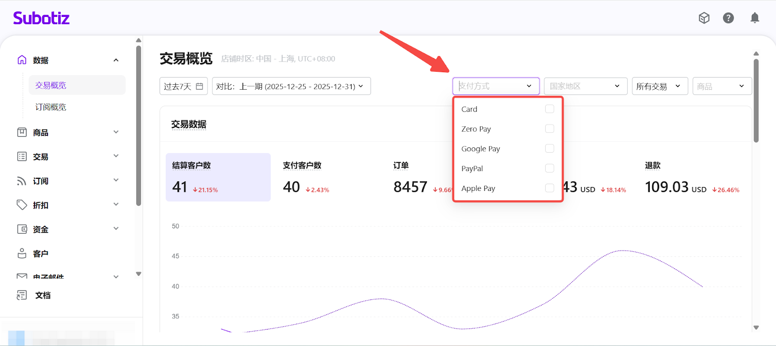 - 按支付方式筛选:通过页面顶部的 支付方式 下拉菜单,可按不同支付方式筛选交易数据,例如:Card、Apple Pay、Google Pay、PayPal 或 Zero Pay。该筛选条件可用于分析不同支付方式的使用情况、交易表现及转化差异,帮助识别更适合目标市场的支付选项。筛选后,页面仅统计使用所选支付方式完成的交易数据。