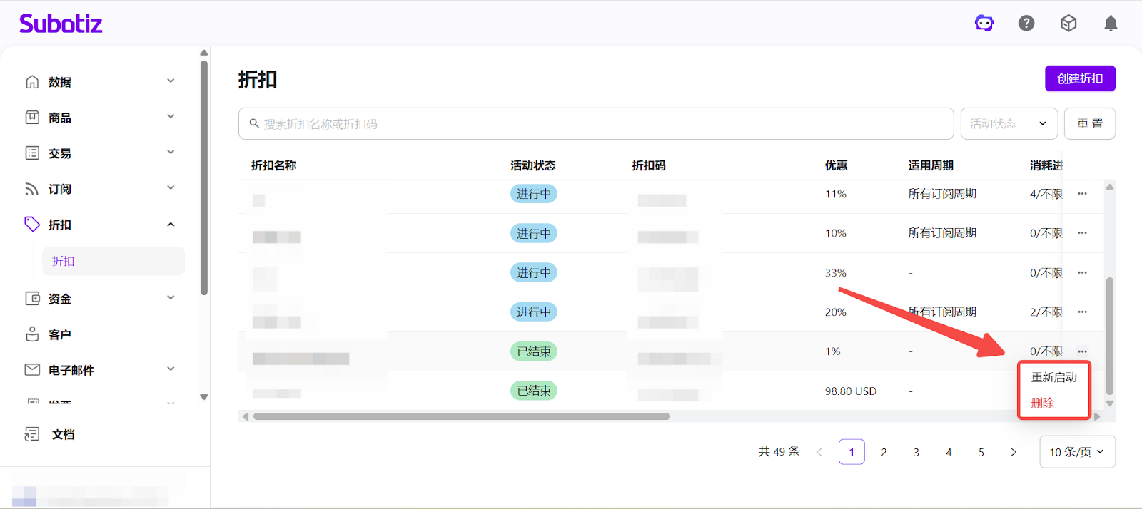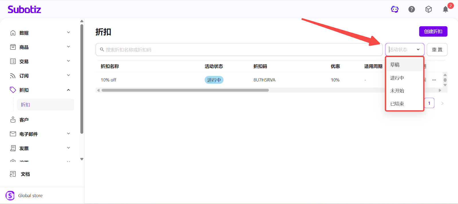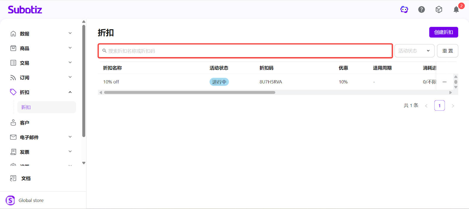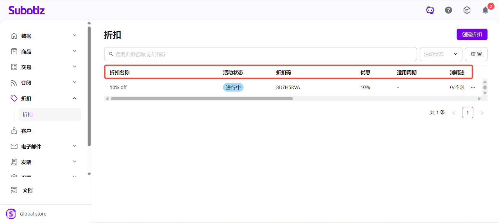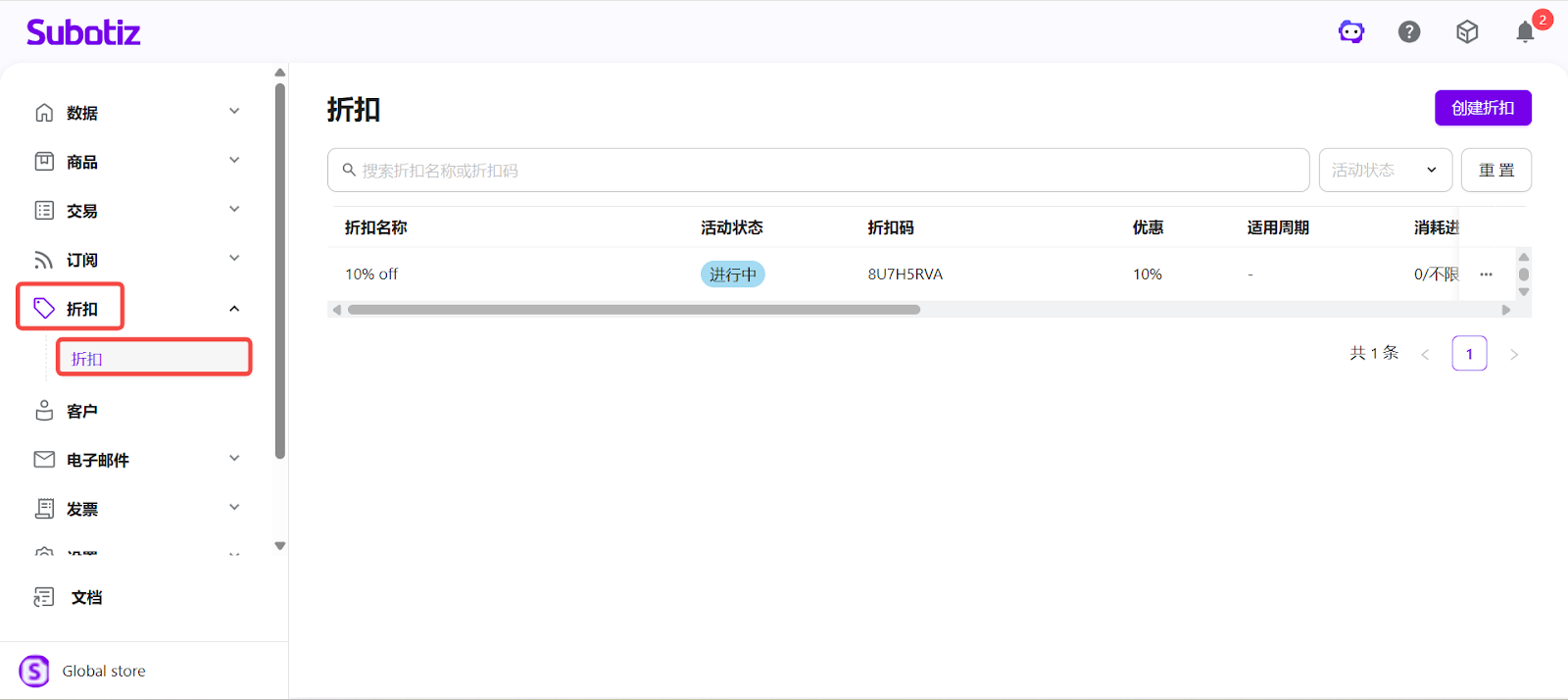 - 进入折扣列表:在 Subotiz 后台进入 折扣 > 折扣,打开折扣活动列表页面。页面将展示全部已创建活动及其核心信息。