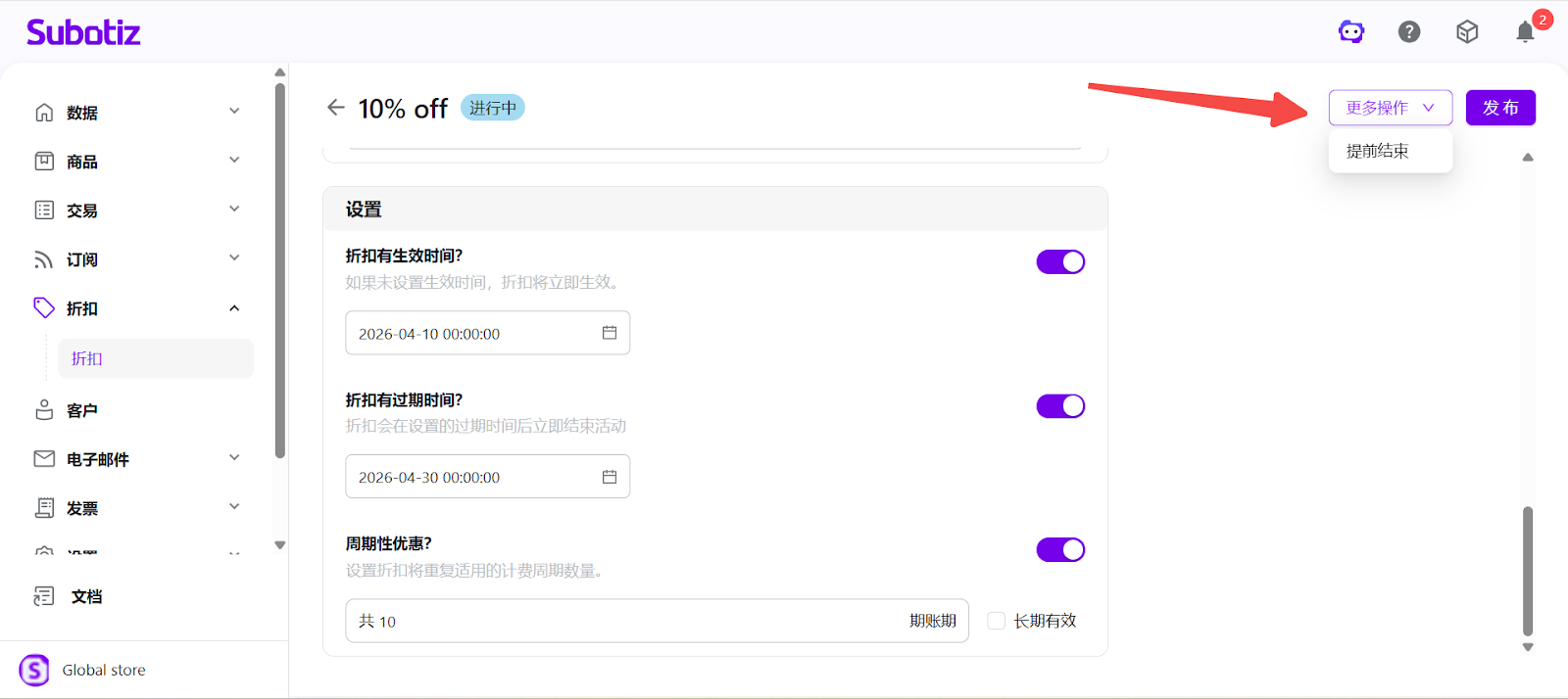 Subotiz 的折扣活动管理功能为商家提供清晰、高效的管理入口,支持对折扣活动进行查看、筛选与状态管理,支持商家高效管理折扣活动,确保促销策略执行清晰且可控。