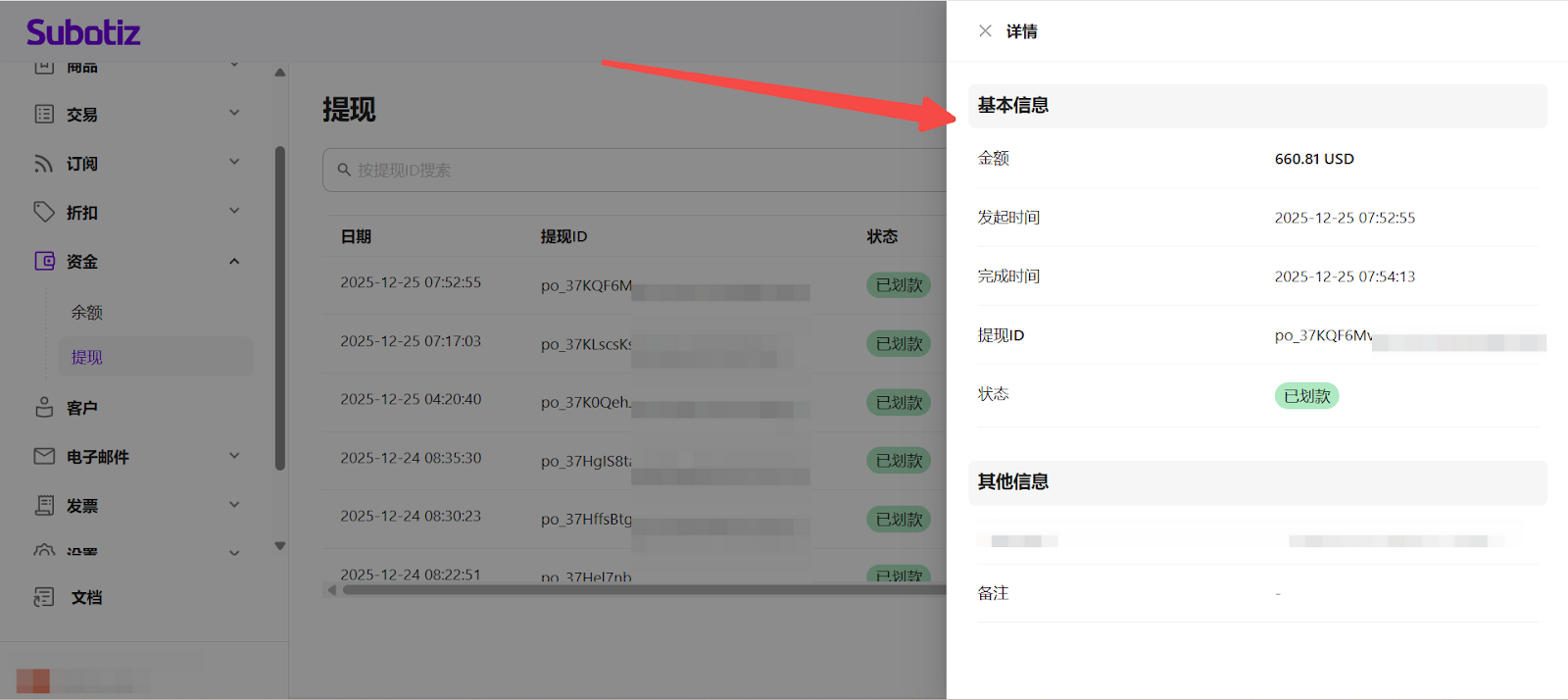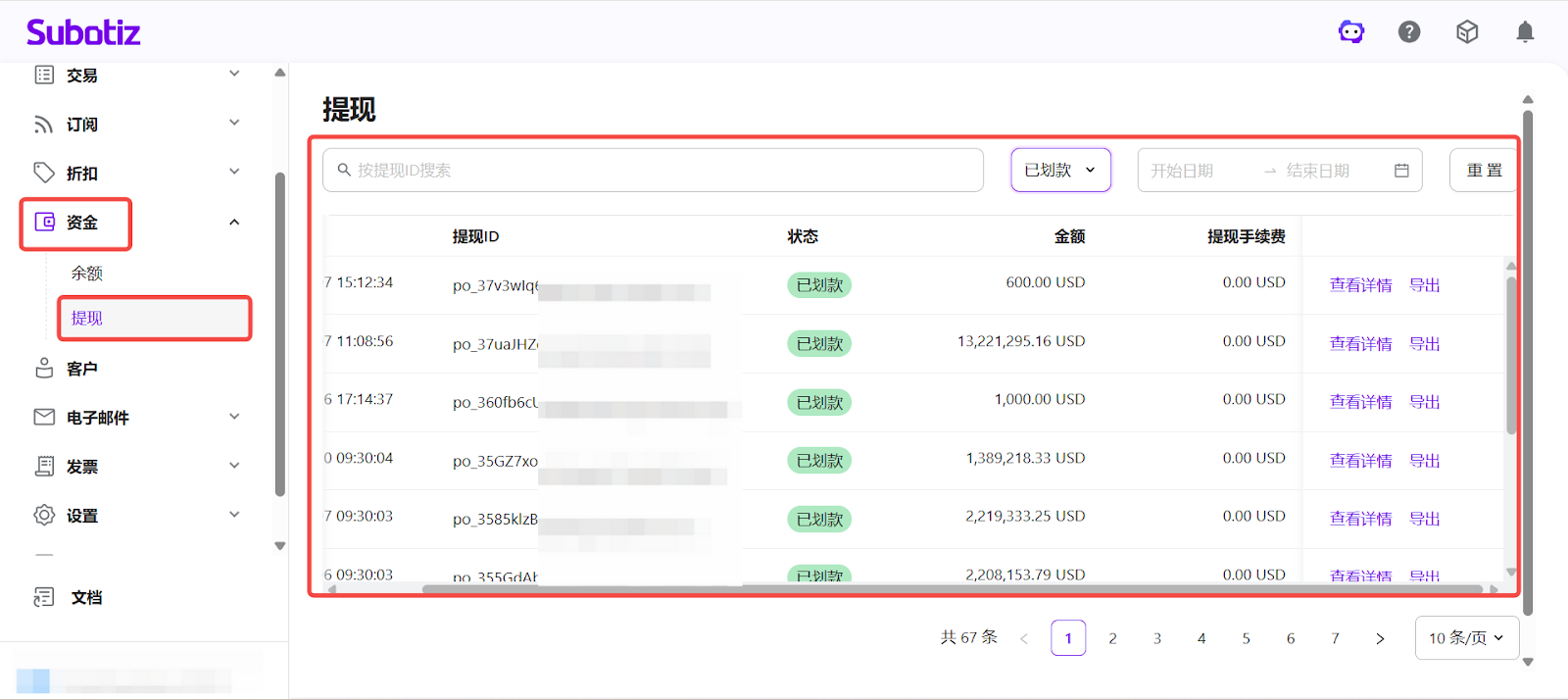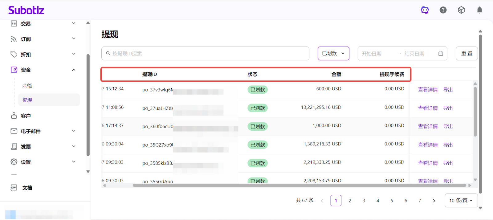 - 进入提现页面: 登录 Subotiz 后台,点击 资金 > 提现,即可查看全部提现记录。