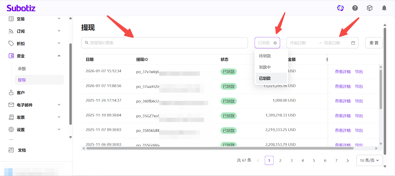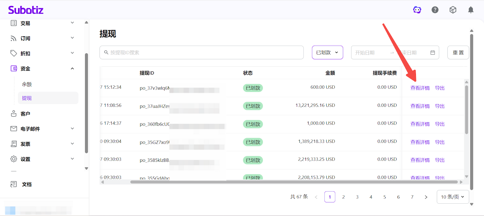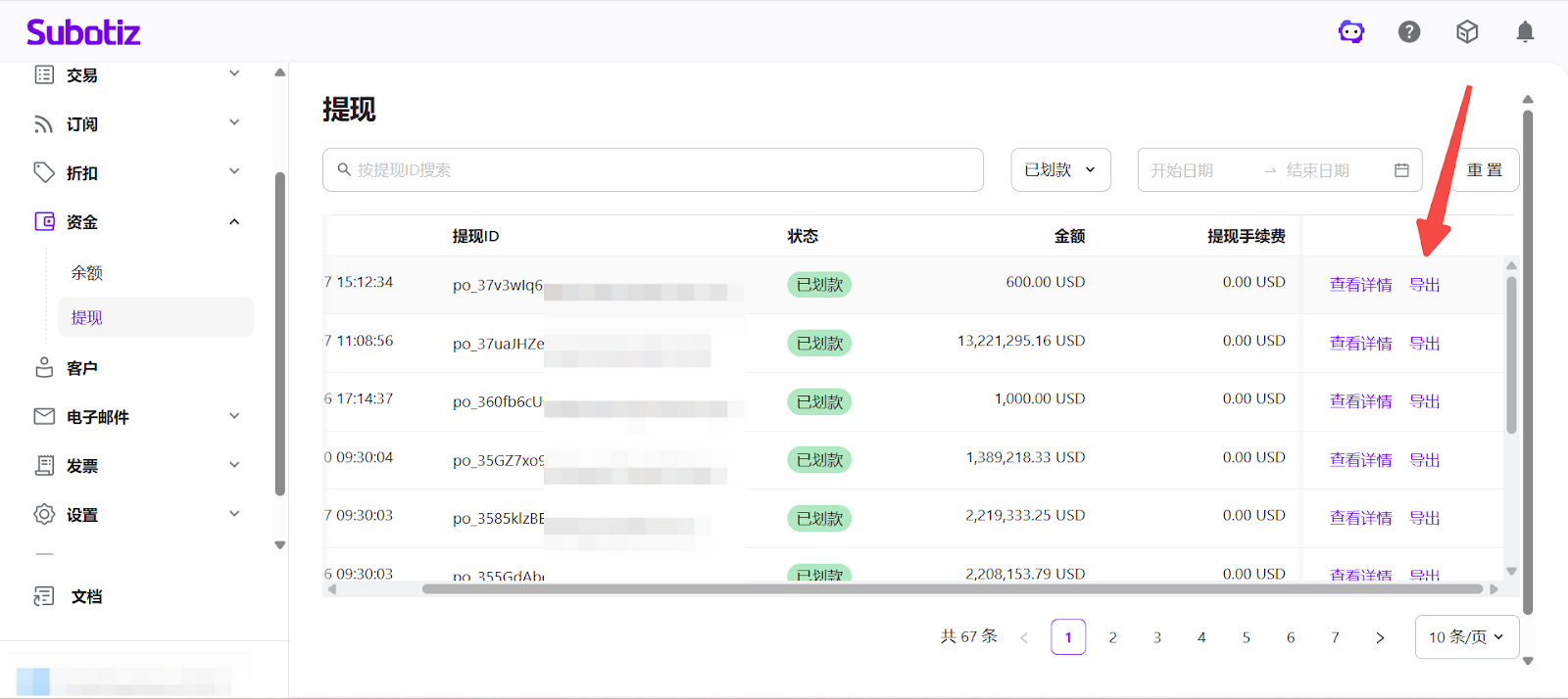 - 进入提现页面: 登录 Subotiz 后台,点击 资金 > 提现,即可查看全部提现记录。
