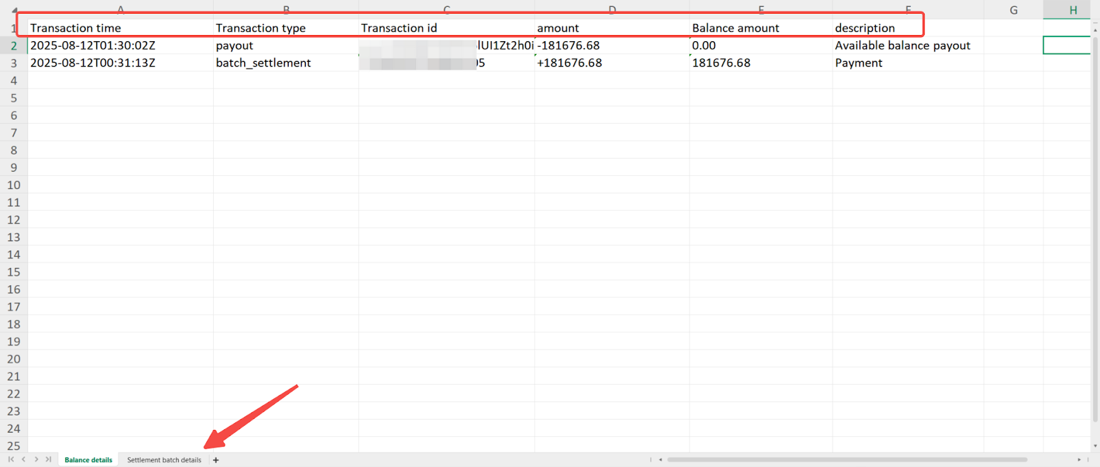 - 提现明细表:展示该笔提现包含的交易记录、手续费及对应的余额变动情况。这些文件可帮助商家核对提现计算方式、验证结算准确性,并辅助财务对账与数据核对。