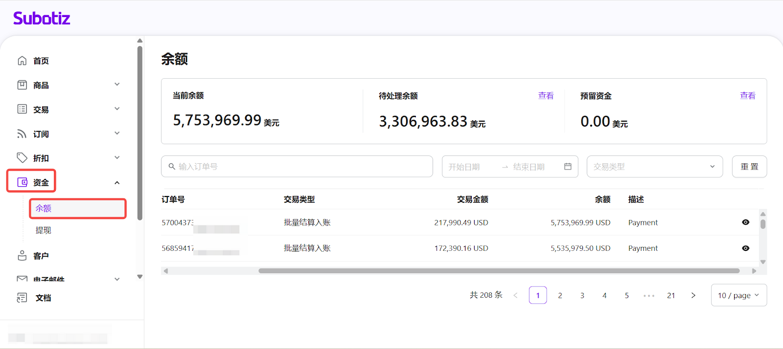 余额中心是 Subotiz 平台的核心财务看板,它将所有交易活动统一汇总至一个页面,便于商家: