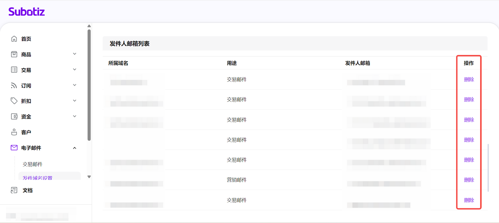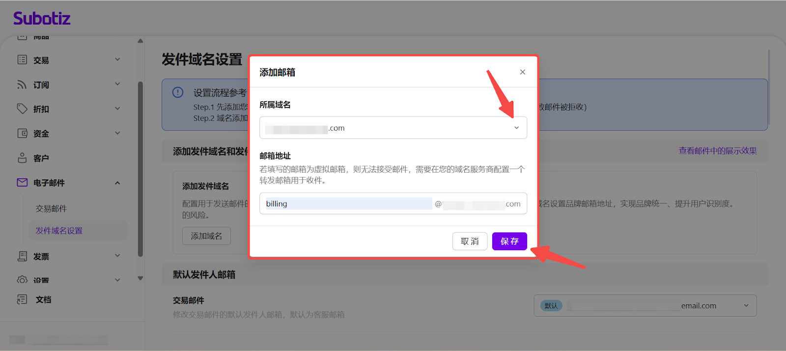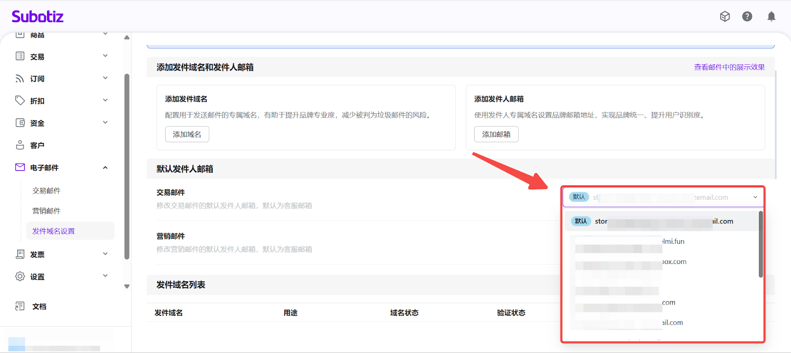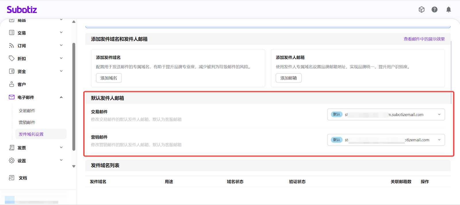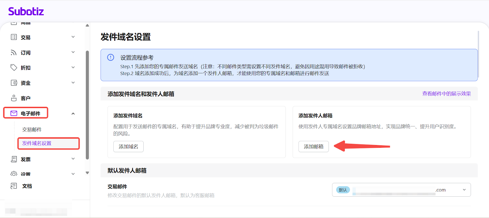 - 进入发件邮箱设置:在 Subotiz 后台进入 电子邮件 > 发件域名设置,在已验证的域名下点击 添加邮箱。